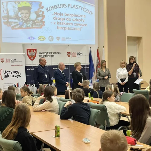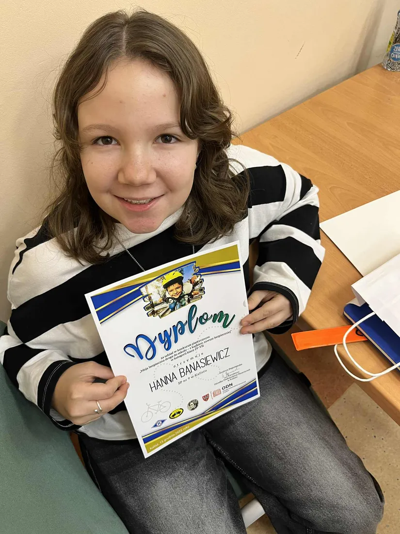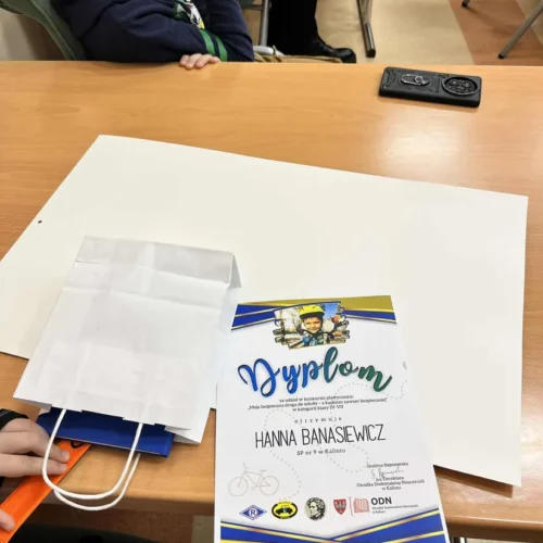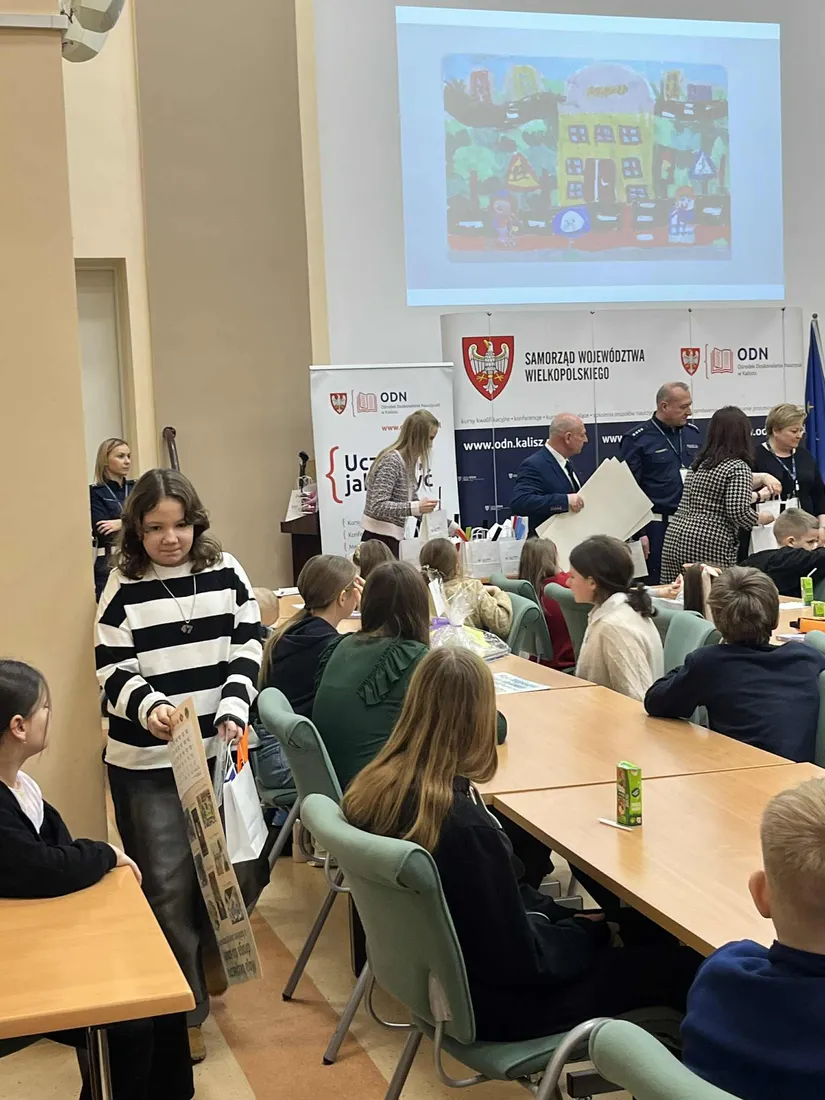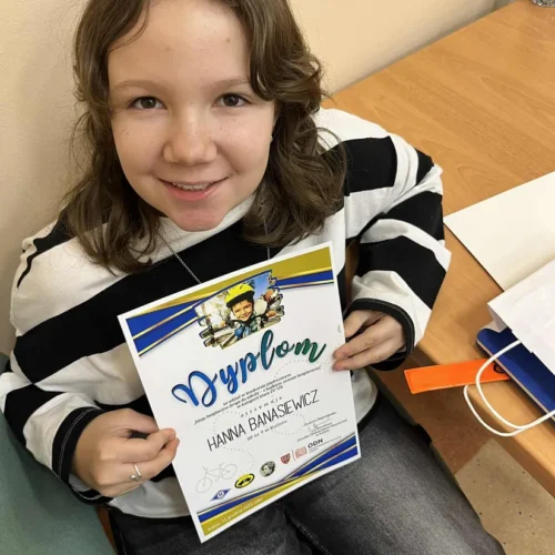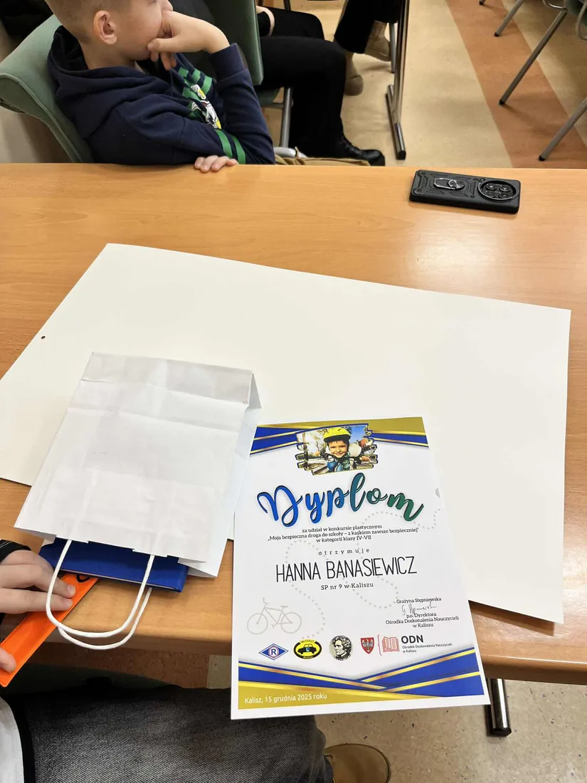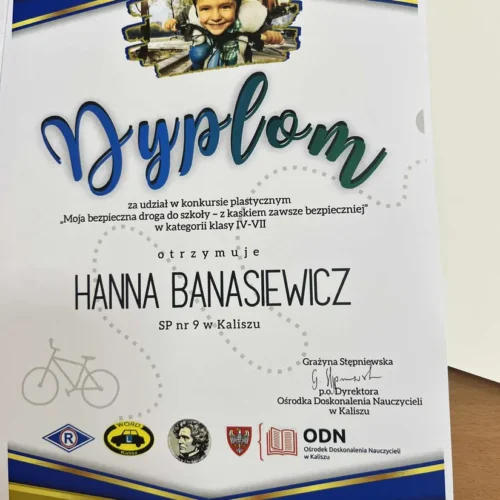 15 grudnia 2025 r. w Ośrodku Doskonalenia Nauczycieli w Kaliszu odbył się finał XXVI edycji konkursu plastycznego „Moja bezpieczna droga do szkoły – w kasku zawsze bezpieczniej”. Do etapu finałowego zakwalifikowała się uczennica klasy 6a – Hanna Banasiewicz.