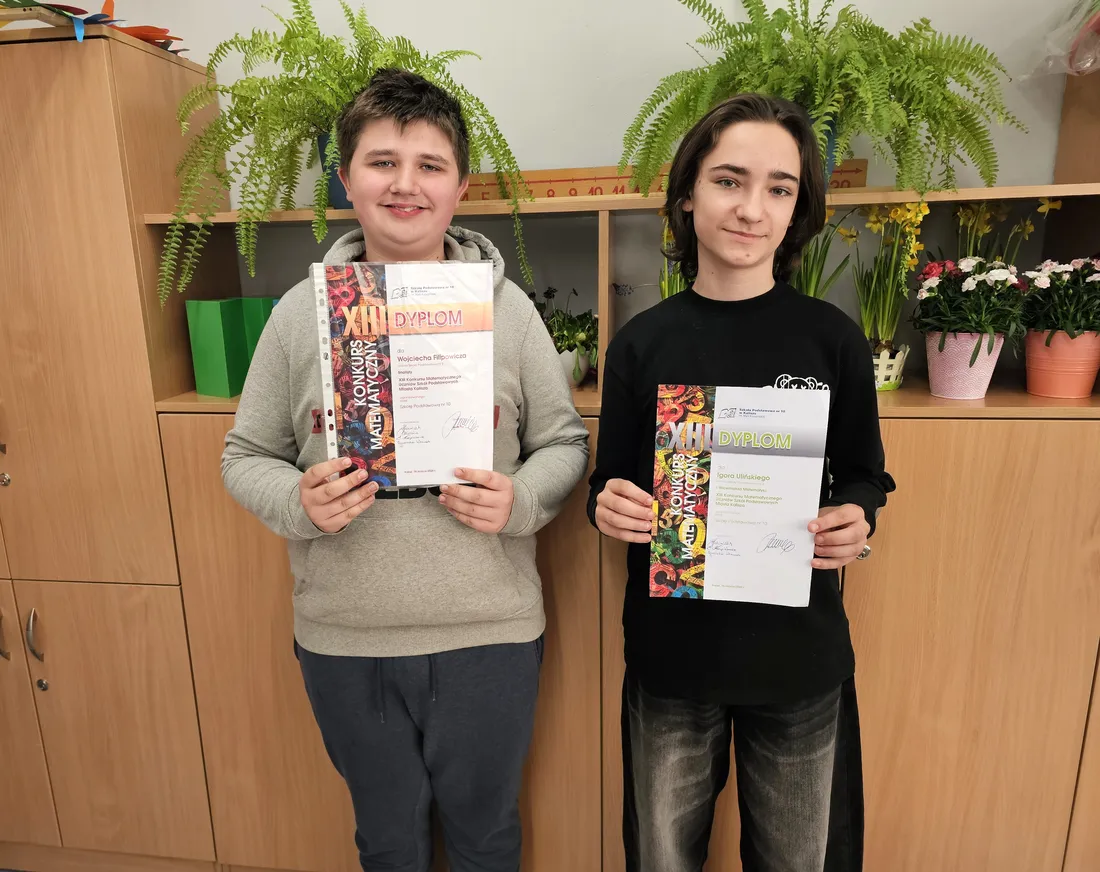 Z radością informujemy, że uczniowie naszej szkoły odnieśli sukces w XIII Konkursie Matematycznym dla klas 7, organizowanym przez Szkołę Podstawową nr 10 w Kaliszu.