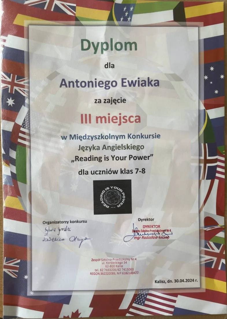 Antoni Ewiak z klasy 8a zdobył III miejsce w Międzyszkolnym Konkursie z języka angielskiego „Reading is Your Power”, organizowanym przez Szkołę Podstawową nr 13 w Kaliszu.