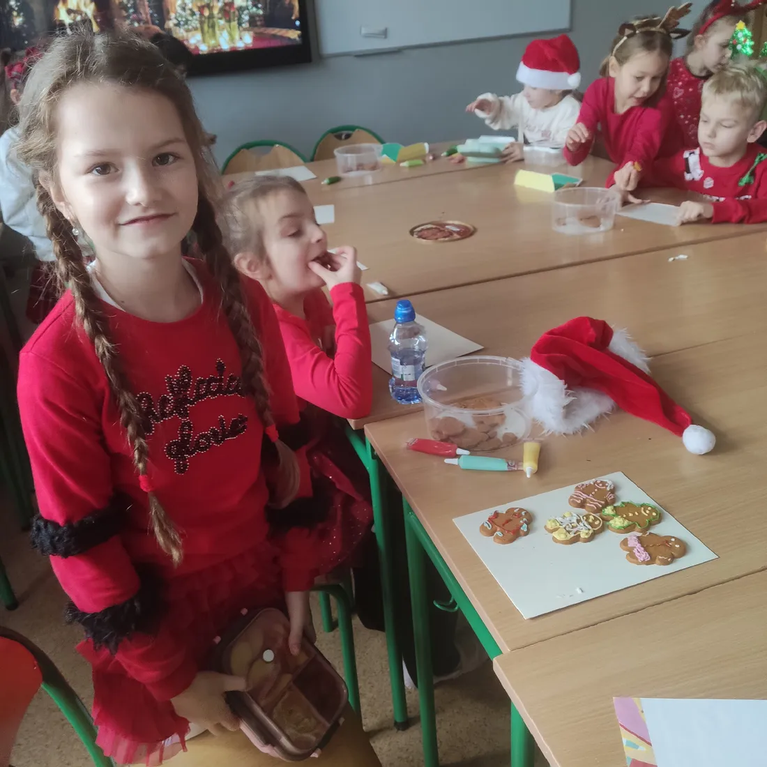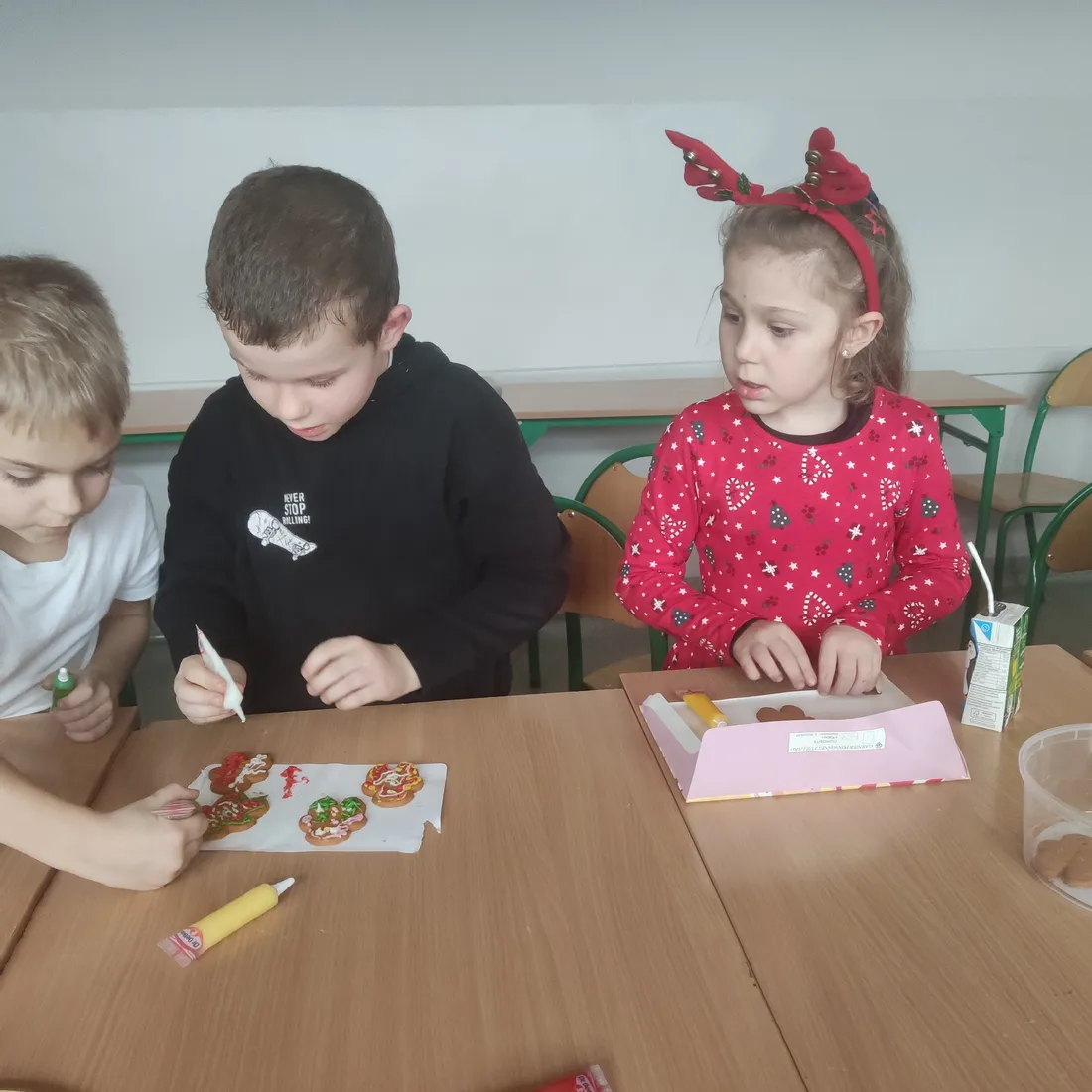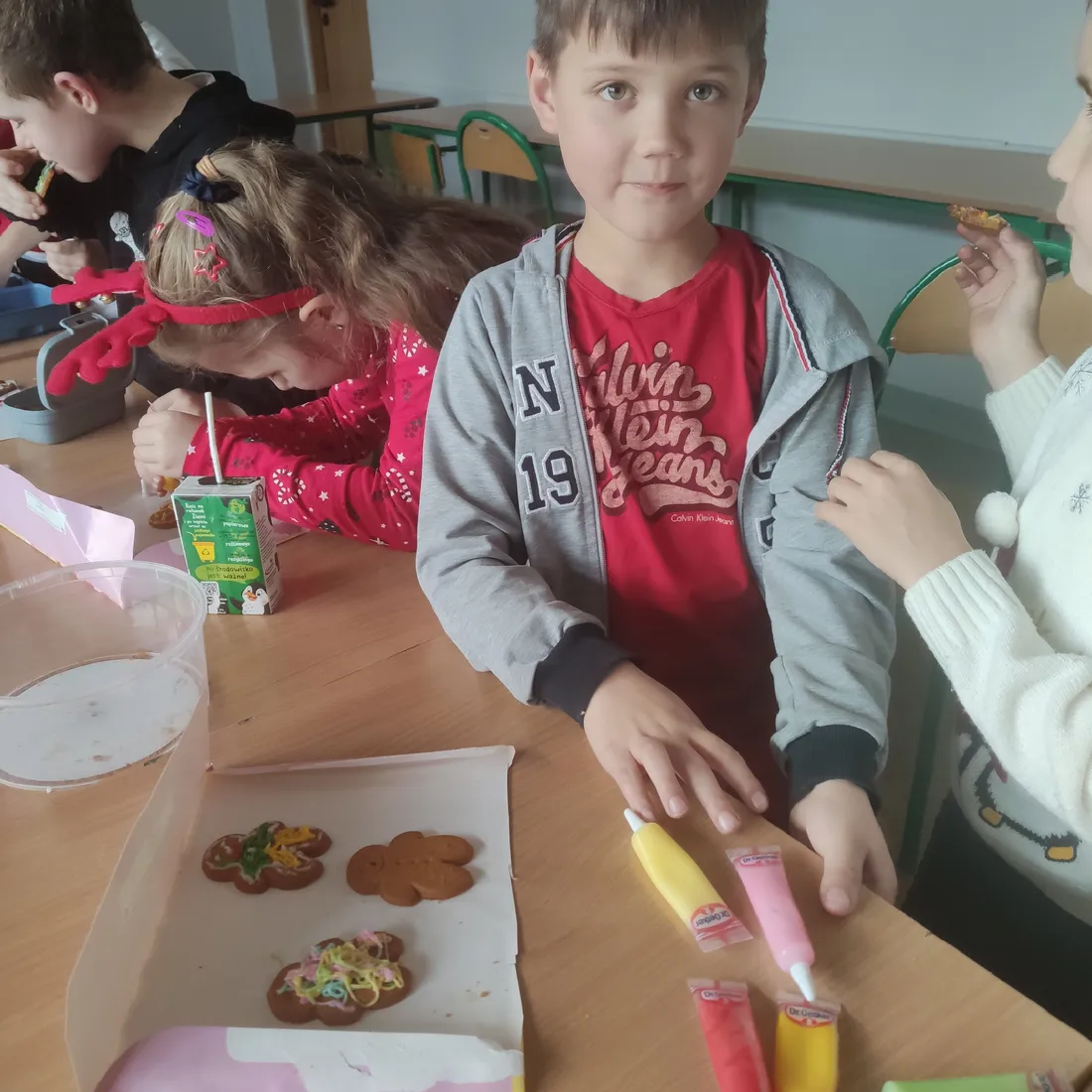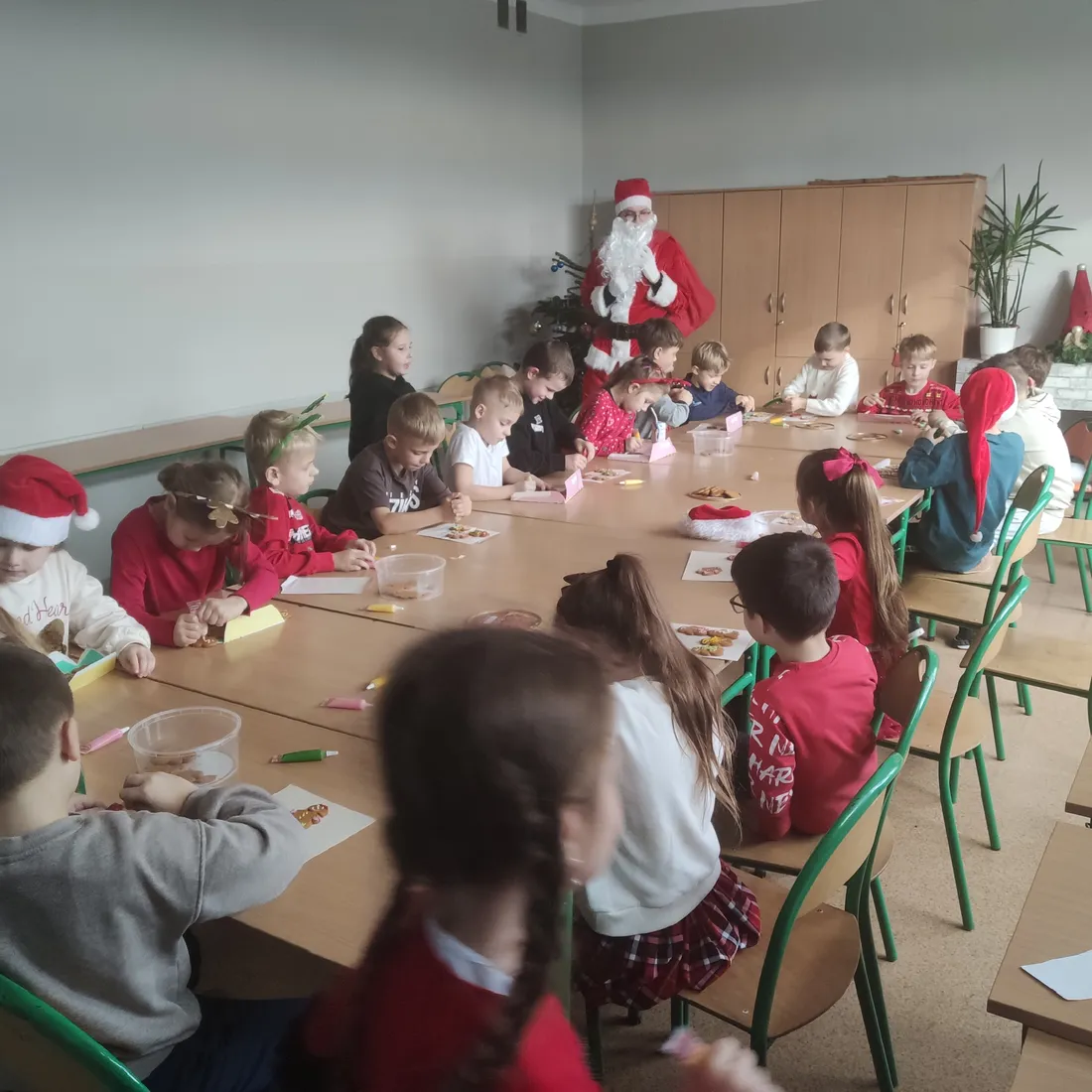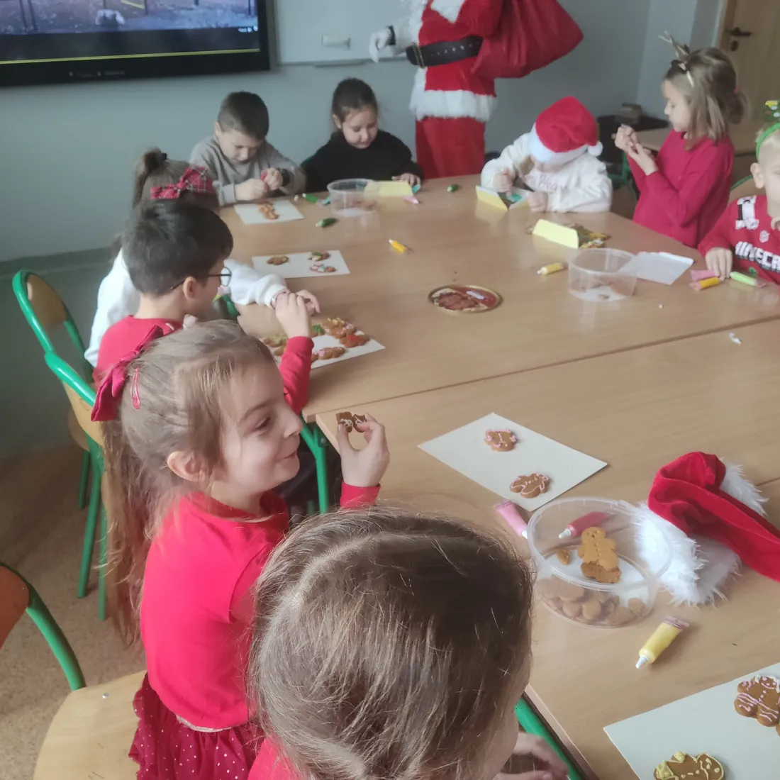 Wczoraj uczniowie klasy 1B mieli wyjątkowych gości! Dzieci spotkały się ze Świętym Mikołajem, z którym wspólnie dekorowały pierniki i pisały listy pełne marzeń. Każdy uczeń zrobił sobie pamiątkowe zdjęcie z Mikołajem, a na koniec wszyscy otrzymali drobny upominek