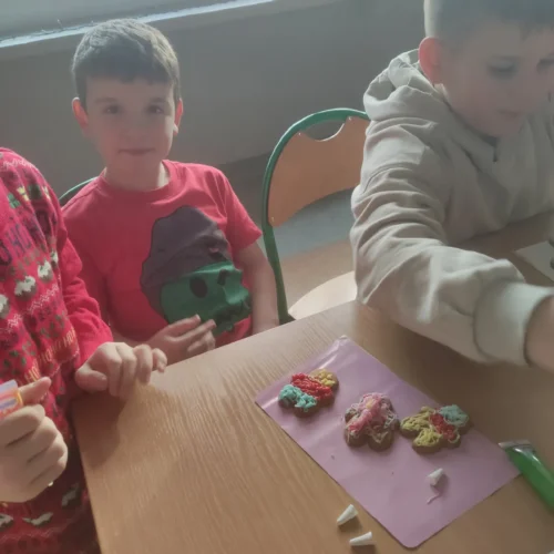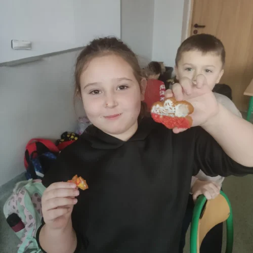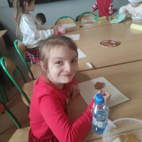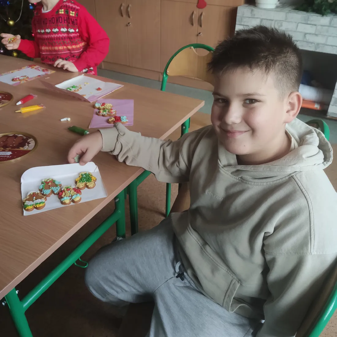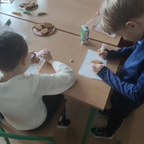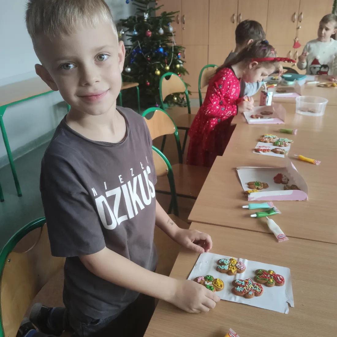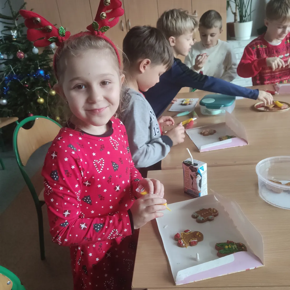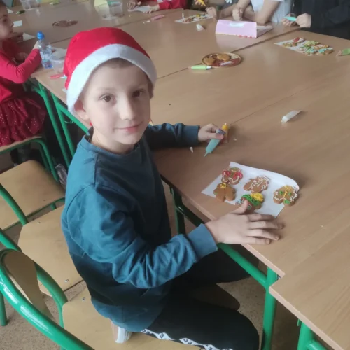Wczoraj uczniowie klasy 1B mieli wyjątkowych gości! Dzieci spotkały się ze Świętym Mikołajem, z którym wspólnie dekorowały pierniki i pisały listy pełne marzeń. Każdy uczeń zrobił sobie pamiątkowe zdjęcie z Mikołajem, a na koniec wszyscy otrzymali drobny upominek