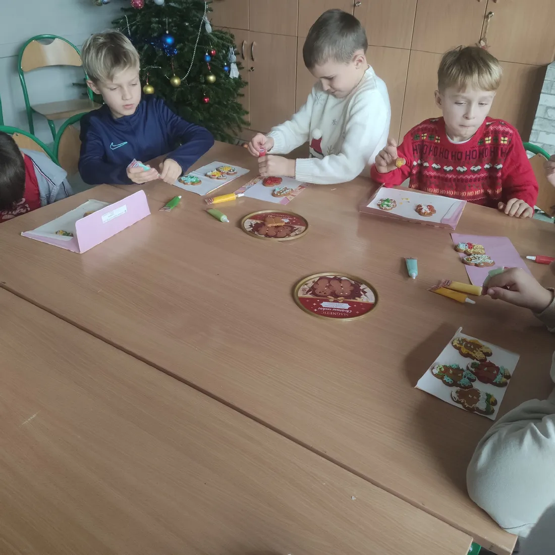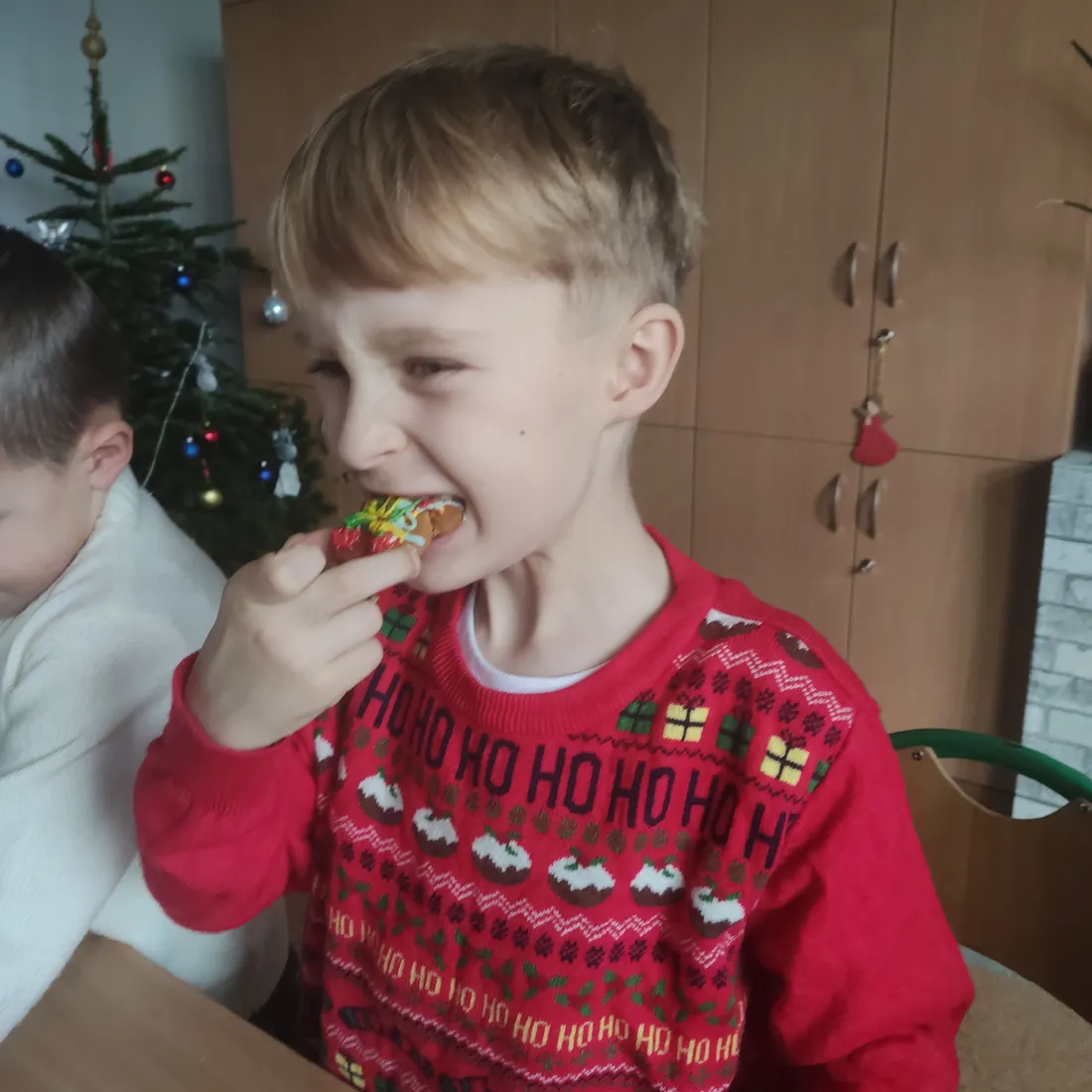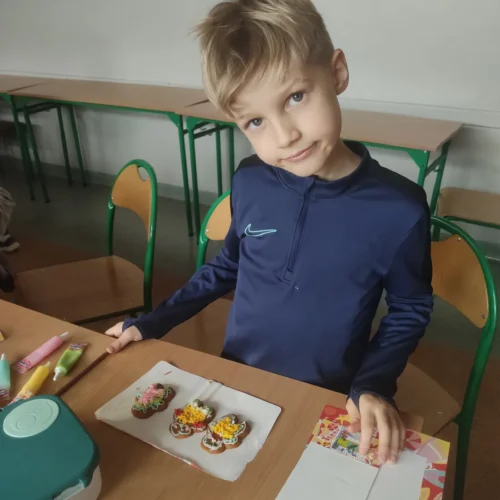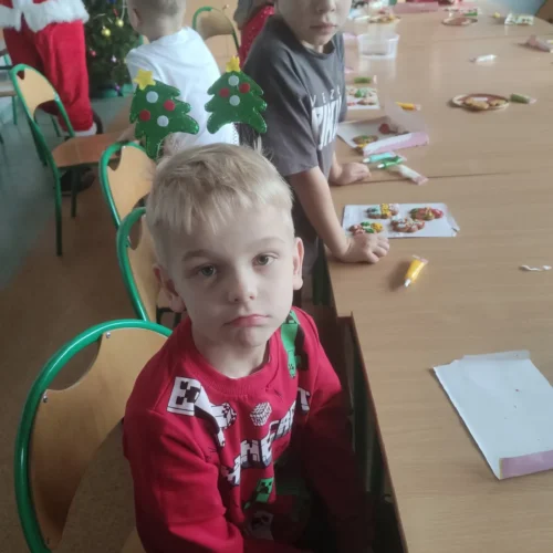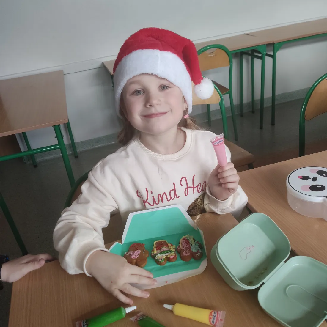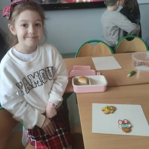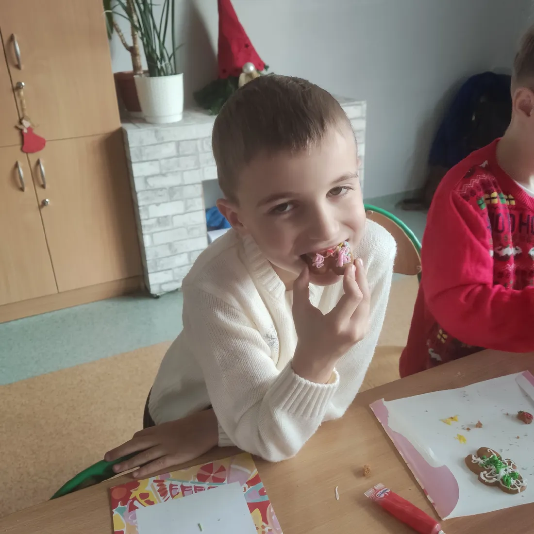 Wczoraj uczniowie klasy 1B mieli wyjątkowych gości! Dzieci spotkały się ze Świętym Mikołajem, z którym wspólnie dekorowały pierniki i pisały listy pełne marzeń. Każdy uczeń zrobił sobie pamiątkowe zdjęcie z Mikołajem, a na koniec wszyscy otrzymali drobny upominek