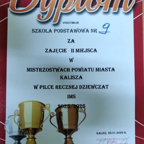 W dniu 29.01.2026 odbyły się MISTRZOSTWA MIASTA KALISZA w piłce ręcznej DZIEWCZĄT klas 7-8. Dziewczęta po zaciętej walce pokonały takie szkoły jak: SP14, SP8, SP18, ulegając tylko gospodarzowi SP10, zdobywając tytuł Vice Mistrza Miasta Kalisza w Piłce Ręcznej. Zawodniczki wystartowały w składzie: