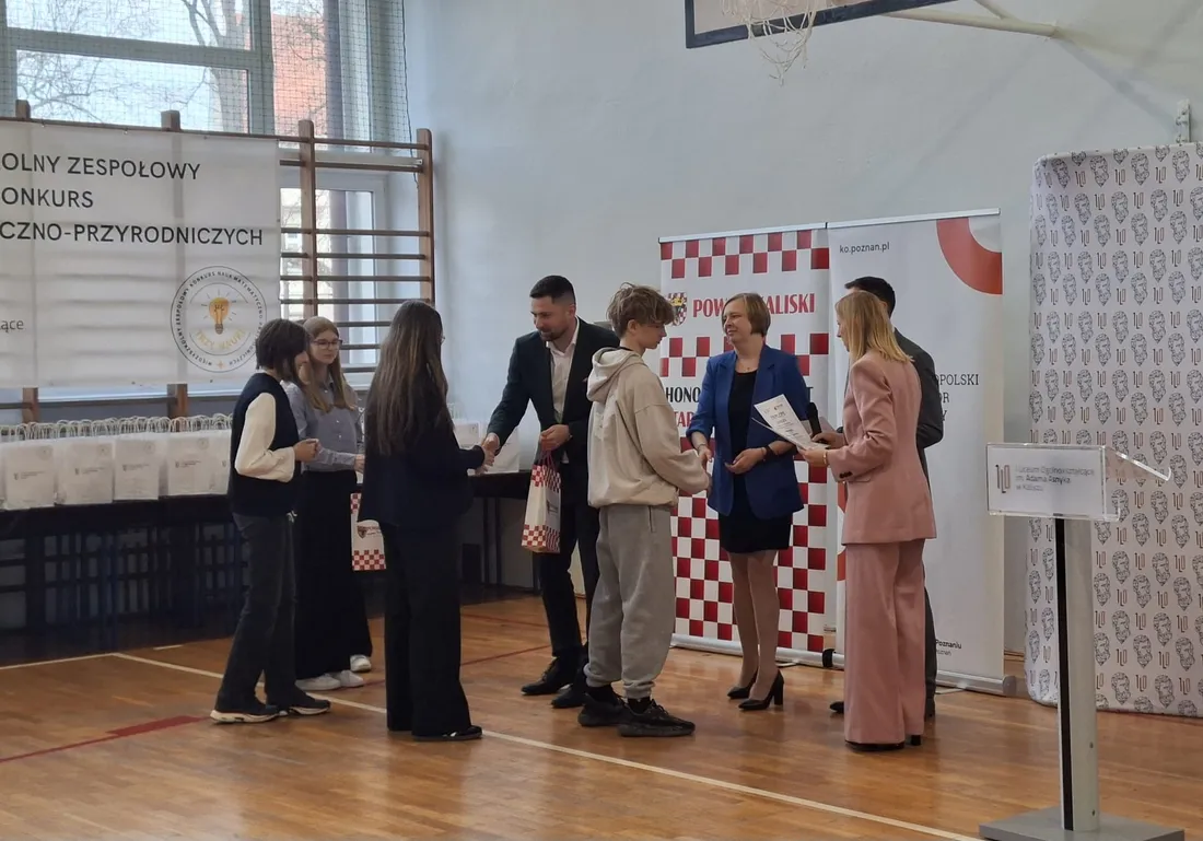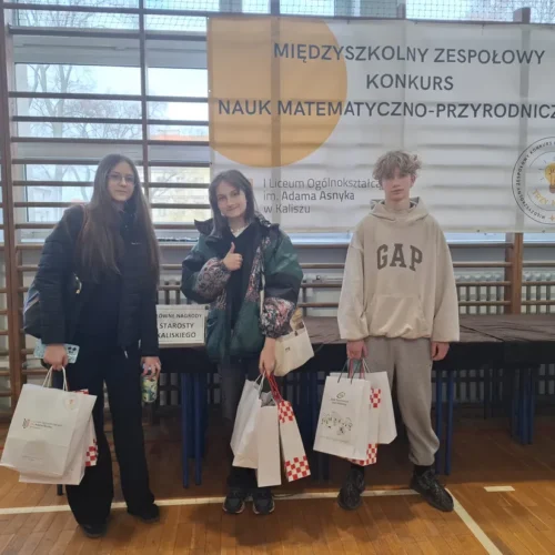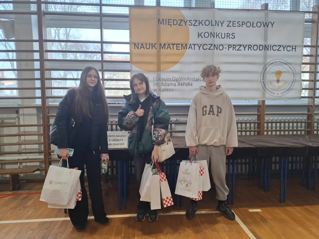 Drużyna naszej szkoły zdobyła I miejsce w Międzyszkolnym Zespołowym Konkursie Nauk Matematyczno–Przyrodniczych „Trzy Nauki”. Wydarzenie zostało zorganizowane 20 marca 2026 r. przez I Liceum Ogólnokształcące im. Adama Asnyka w Kaliszu pod patronatem Starostwa Powiatowego oraz Wielkopolskiego Kuratora Oświaty. W konkursie wzięło udział 27 szkół z powiatu kaliskiego.