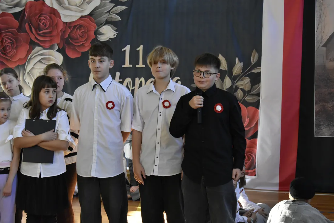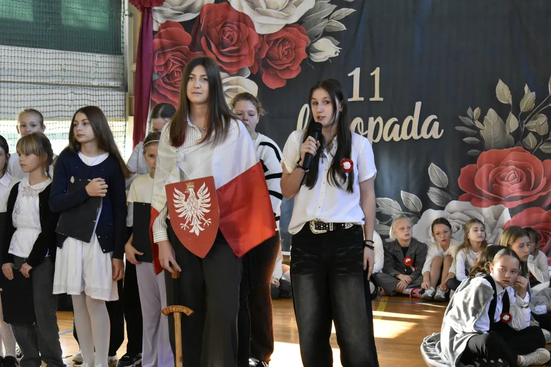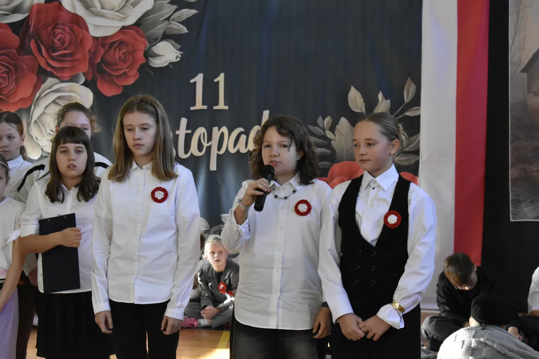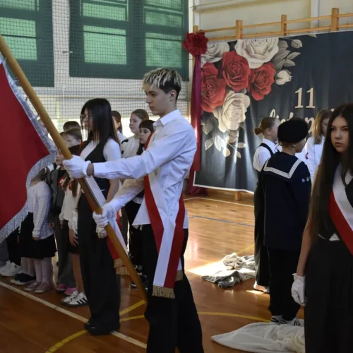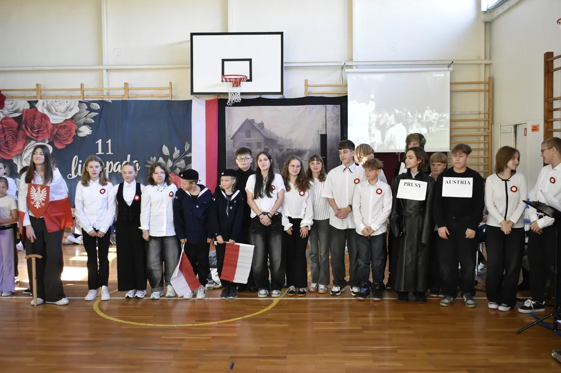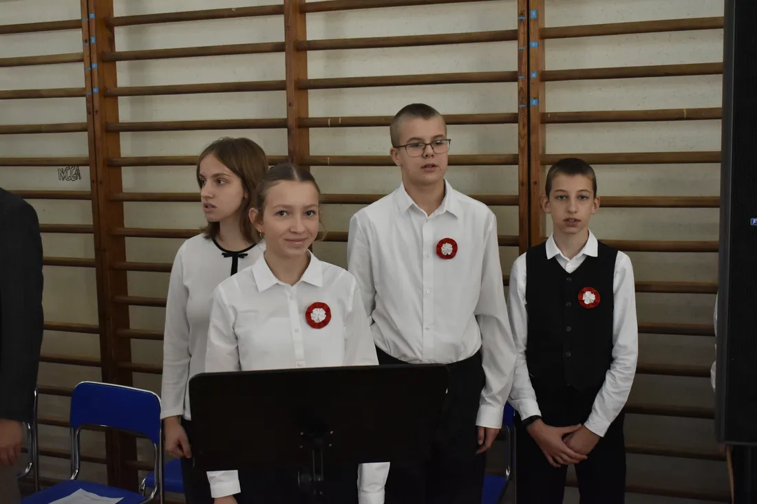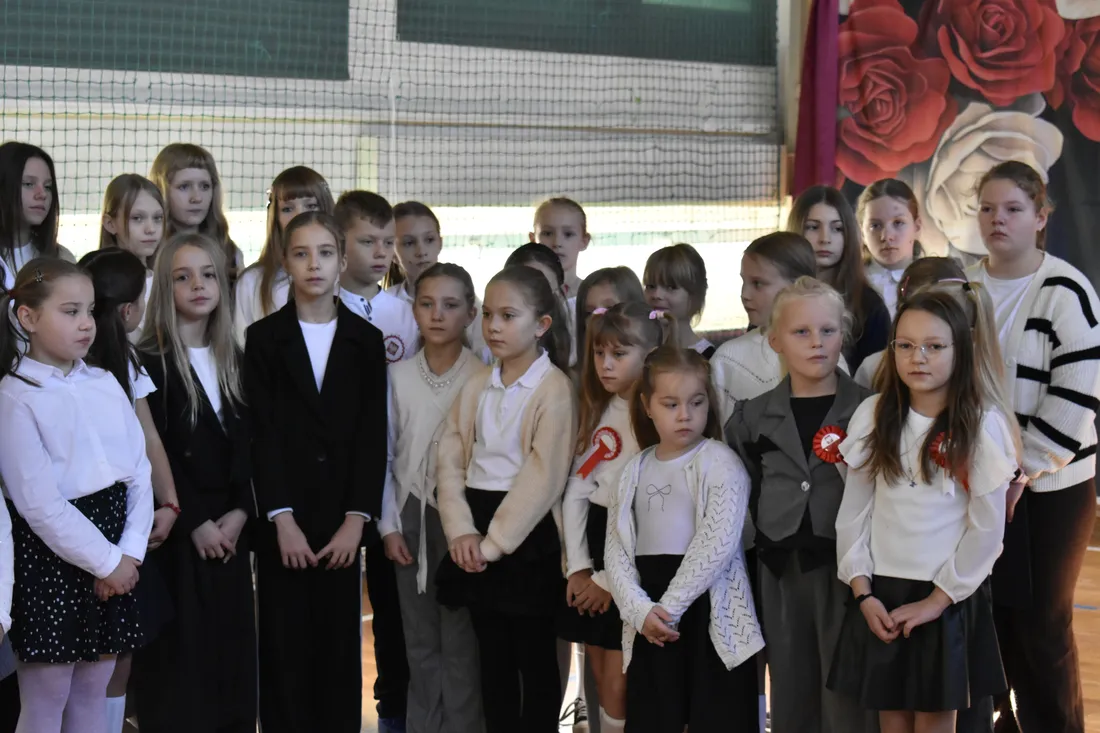 7 listopada uczniowie naszej szkoły uczestniczyli w uroczystości zorganizowanej z okazji rocznicy odzyskania niepodległości. Obejrzeli krótki program przedstawiający nasze drogi do wolności, w którym wystąpili uczniowie kl. 4b, 6a, 7a, 8a i 8b pod kierunkiem p. M. Michałek i p. A. Szczupaka. Występ uświetnił zespół fletów i chór szkolny, prezentując utwory patriotyczne przygotowane przez p. A. Lis. W uroczysty nastrój wprowadziły dekoracje wykonane przez p. I. Brukowską. Następnie głos zabrał p. dyrektor E. Jesiołowski, który podziękował wszystkim za przygotowywanie uroczystości. Przypomniał uczniom, że we wtorek obchodzimy ważne dla Polaków święto – rocznicę odzyskania niepodległości i powinniśmy je uczcić.