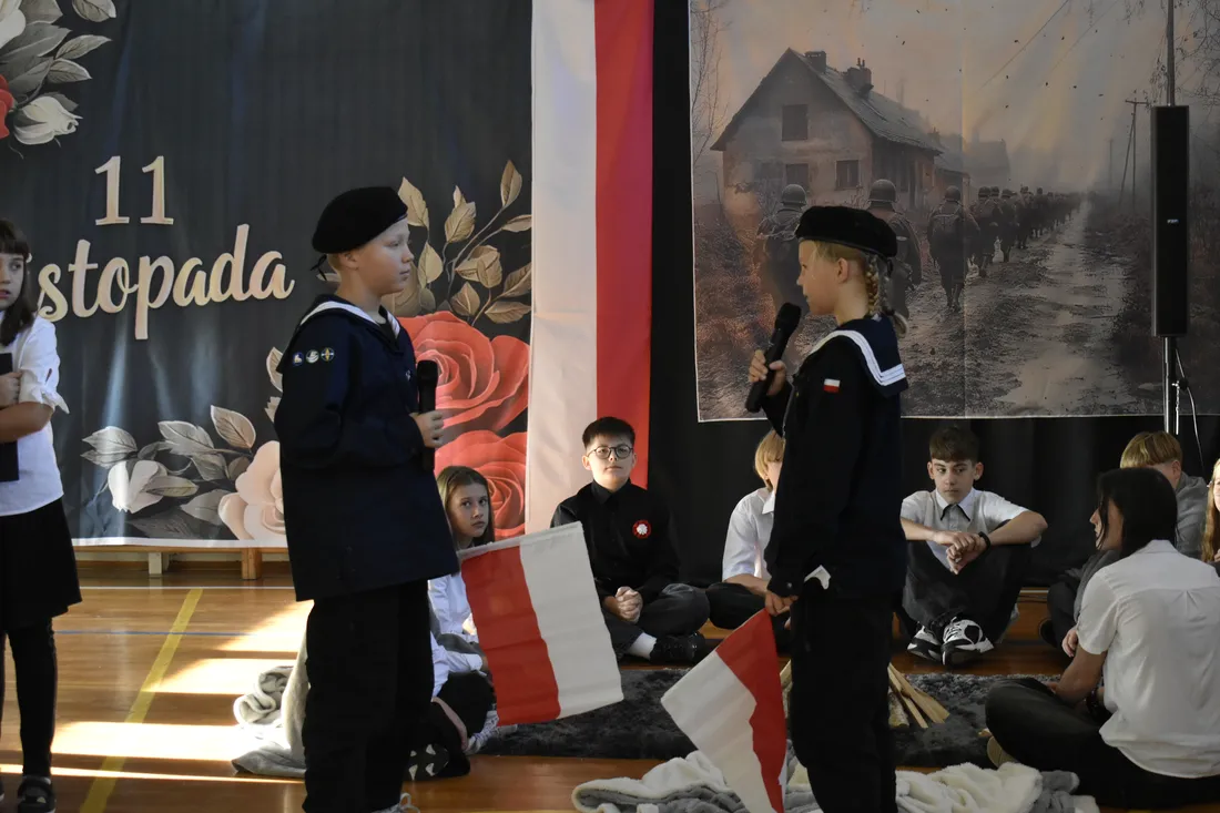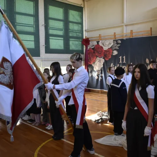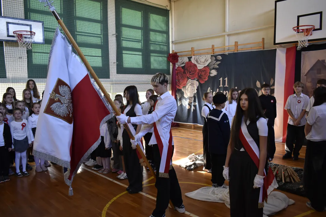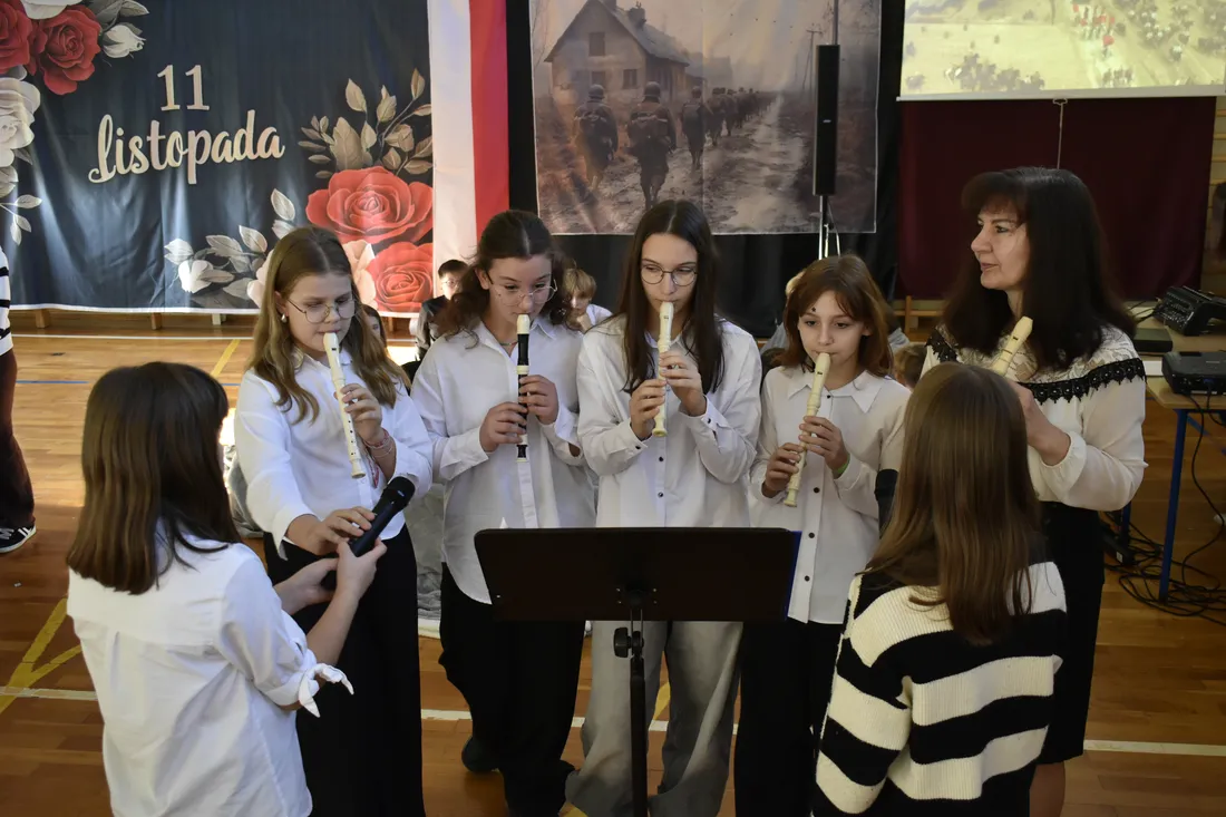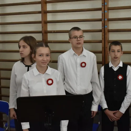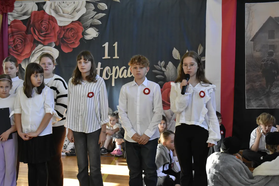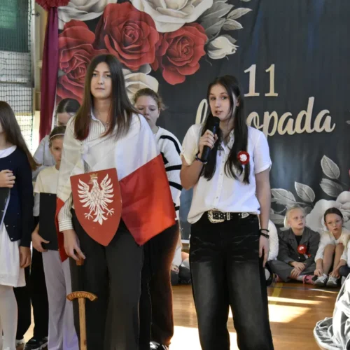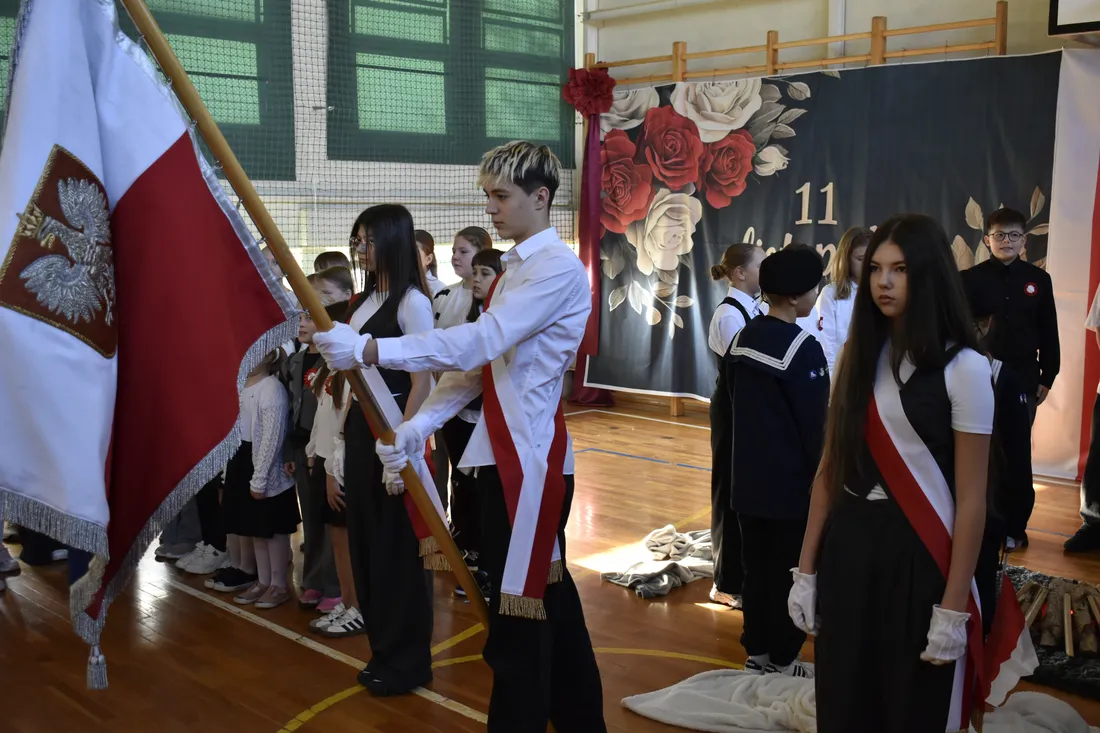 7 listopada uczniowie naszej szkoły uczestniczyli w uroczystości zorganizowanej z okazji rocznicy odzyskania niepodległości. Obejrzeli krótki program przedstawiający nasze drogi do wolności, w którym wystąpili uczniowie kl. 4b, 6a, 7a, 8a i 8b pod kierunkiem p. M. Michałek i p. A. Szczupaka. Występ uświetnił zespół fletów i chór szkolny, prezentując utwory patriotyczne przygotowane przez p. A. Lis. W uroczysty nastrój wprowadziły dekoracje wykonane przez p. I. Brukowską. Następnie głos zabrał p. dyrektor E. Jesiołowski, który podziękował wszystkim za przygotowywanie uroczystości. Przypomniał uczniom, że we wtorek obchodzimy ważne dla Polaków święto – rocznicę odzyskania niepodległości i powinniśmy je uczcić.