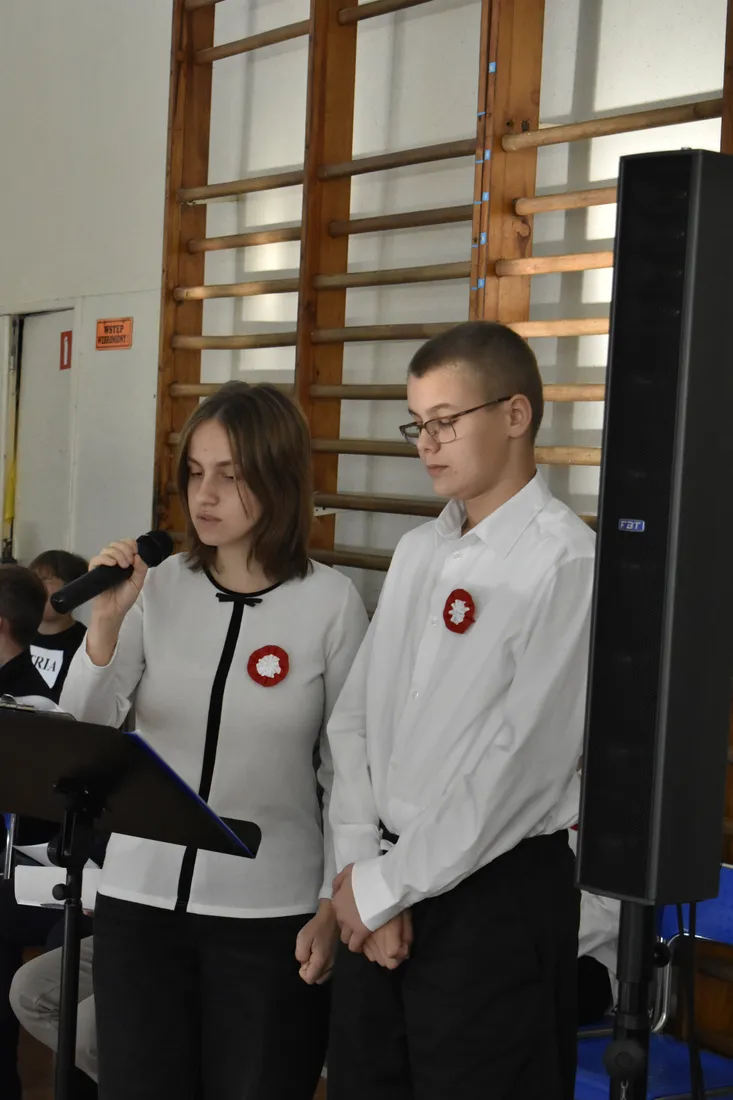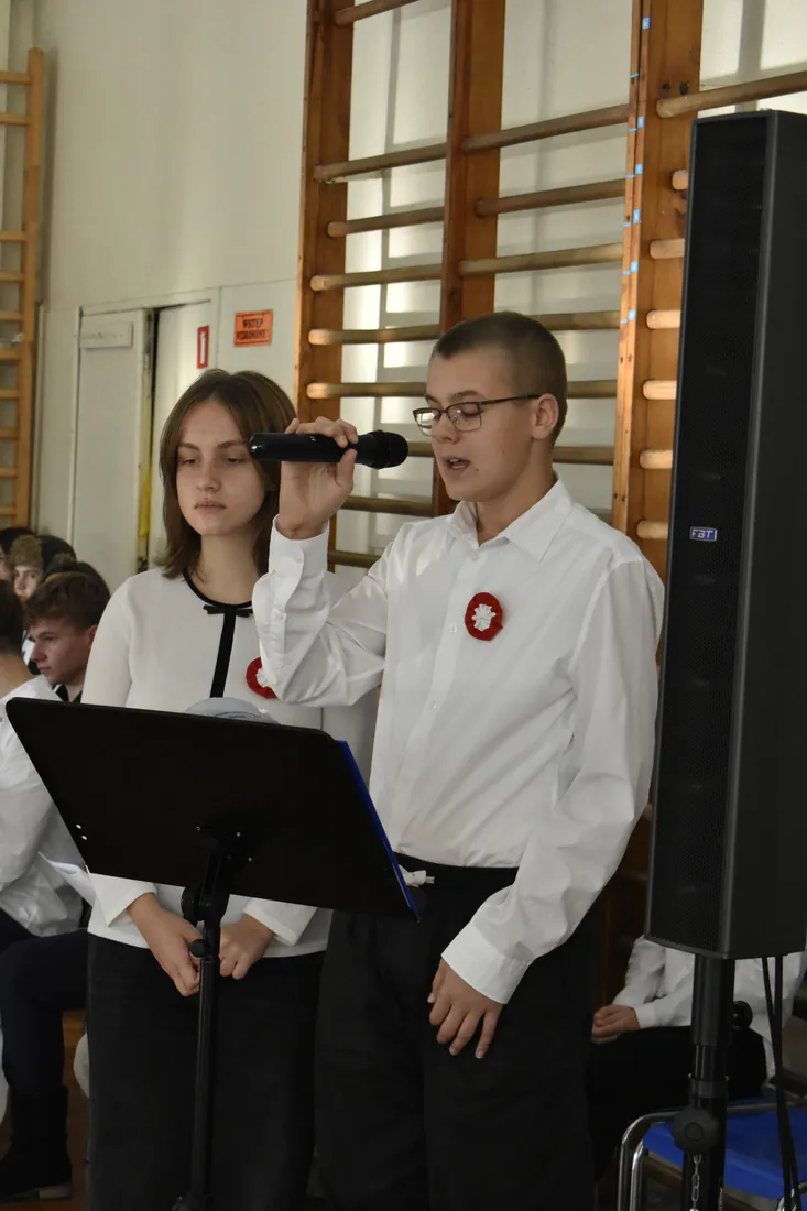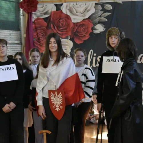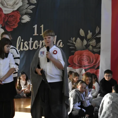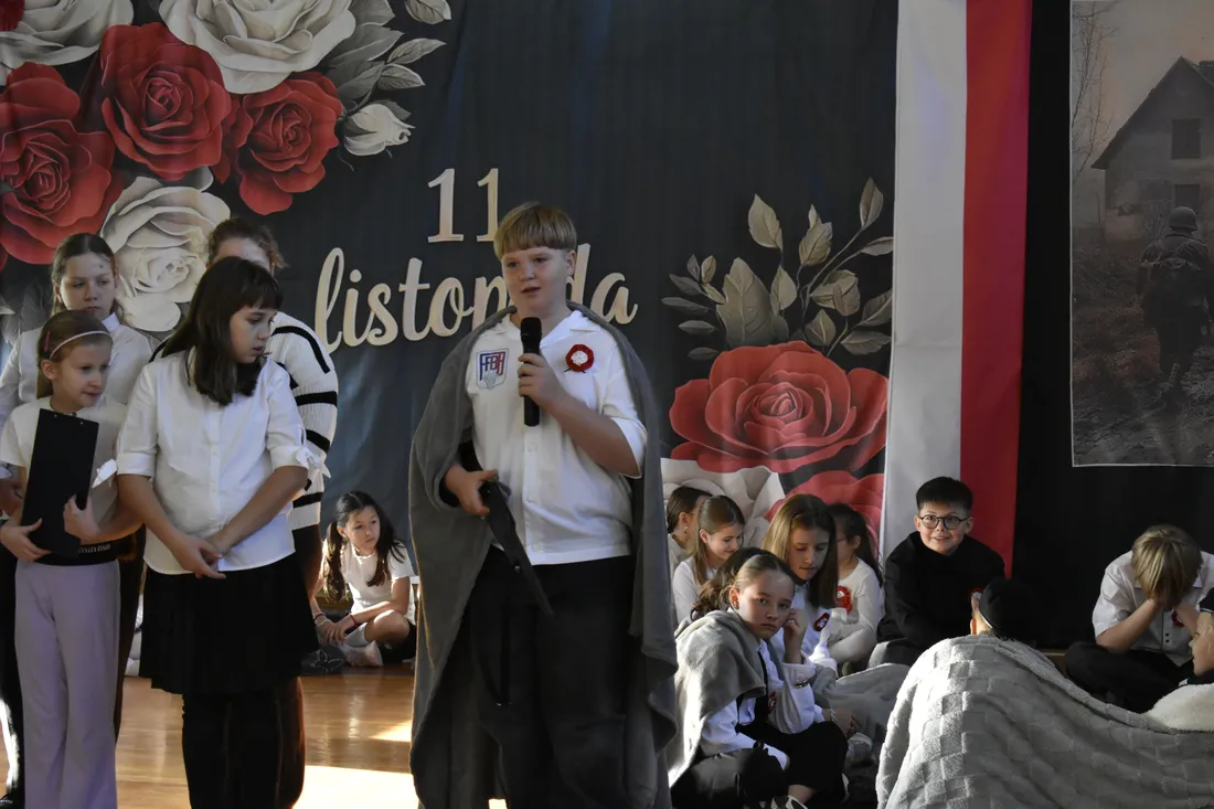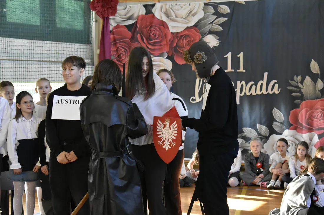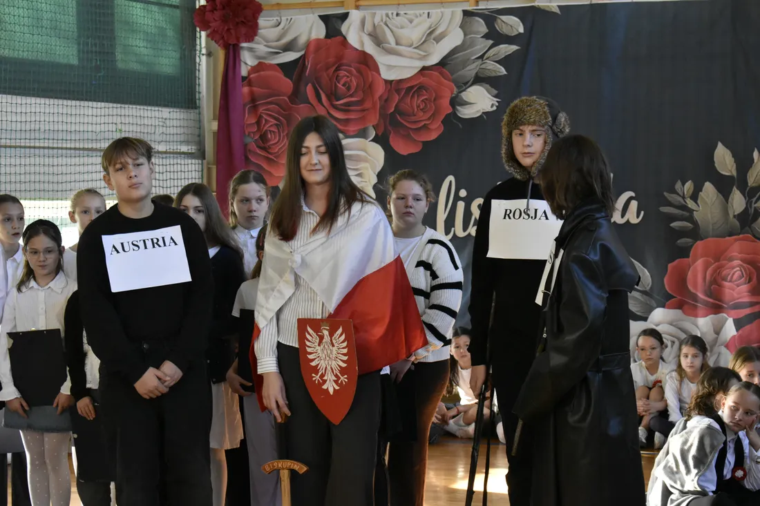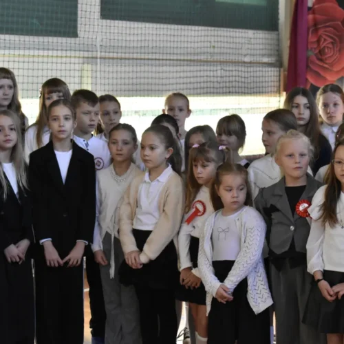7 listopada uczniowie naszej szkoły uczestniczyli w uroczystości zorganizowanej z okazji rocznicy odzyskania niepodległości. Obejrzeli krótki program przedstawiający nasze drogi do wolności, w którym wystąpili uczniowie kl. 4b, 6a, 7a, 8a i 8b pod kierunkiem p. M. Michałek i p. A. Szczupaka. Występ uświetnił zespół fletów i chór szkolny, prezentując utwory patriotyczne przygotowane przez p. A. Lis. W uroczysty nastrój wprowadziły dekoracje wykonane przez p. I. Brukowską. Następnie głos zabrał p. dyrektor E. Jesiołowski, który podziękował wszystkim za przygotowywanie uroczystości. Przypomniał uczniom, że we wtorek obchodzimy ważne dla Polaków święto – rocznicę odzyskania niepodległości i powinniśmy je uczcić.