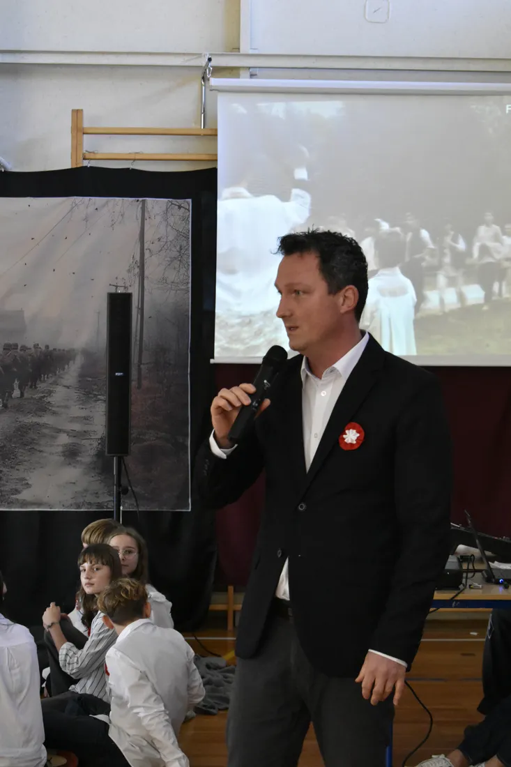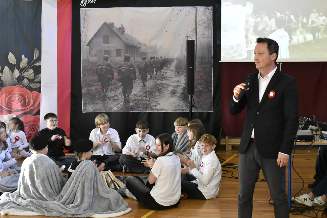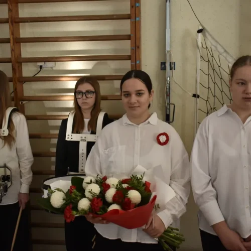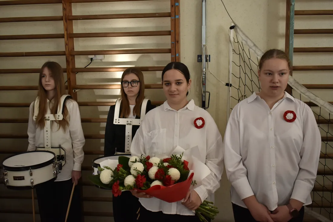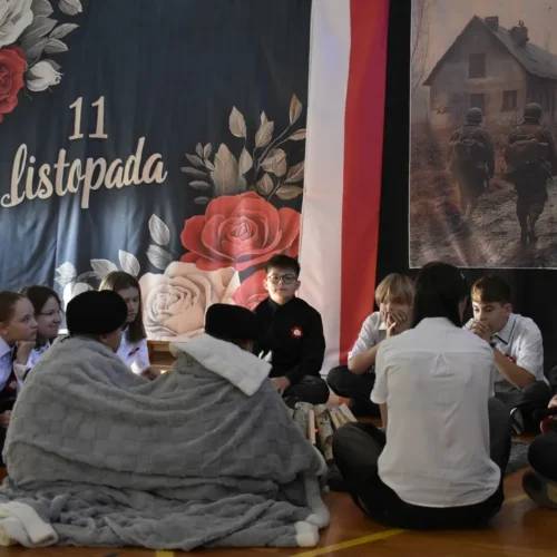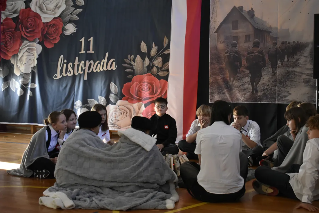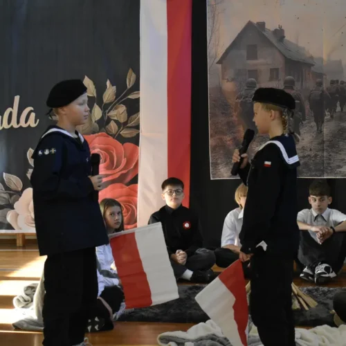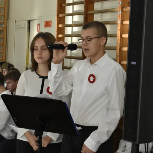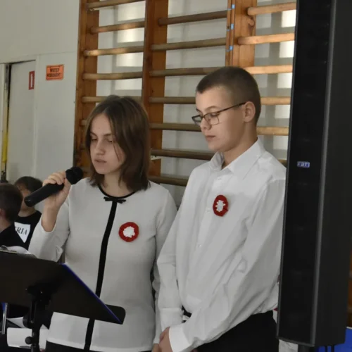 7 listopada uczniowie naszej szkoły uczestniczyli w uroczystości zorganizowanej z okazji rocznicy odzyskania niepodległości. Obejrzeli krótki program przedstawiający nasze drogi do wolności, w którym wystąpili uczniowie kl. 4b, 6a, 7a, 8a i 8b pod kierunkiem p. M. Michałek i p. A. Szczupaka. Występ uświetnił zespół fletów i chór szkolny, prezentując utwory patriotyczne przygotowane przez p. A. Lis. W uroczysty nastrój wprowadziły dekoracje wykonane przez p. I. Brukowską. Następnie głos zabrał p. dyrektor E. Jesiołowski, który podziękował wszystkim za przygotowywanie uroczystości. Przypomniał uczniom, że we wtorek obchodzimy ważne dla Polaków święto – rocznicę odzyskania niepodległości i powinniśmy je uczcić.
