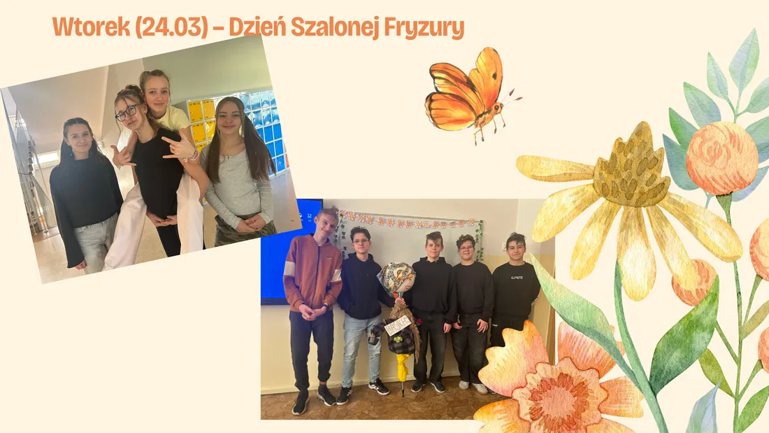 Samorząd Uczniowski klas 4–8 zorganizował w naszej szkole Szalony Wiosenny Tydzień, pełen kreatywnych i radosnych wyzwań dla uczniów. Każdego dnia czekała na uczestników inna tematyczna niespodzianka: