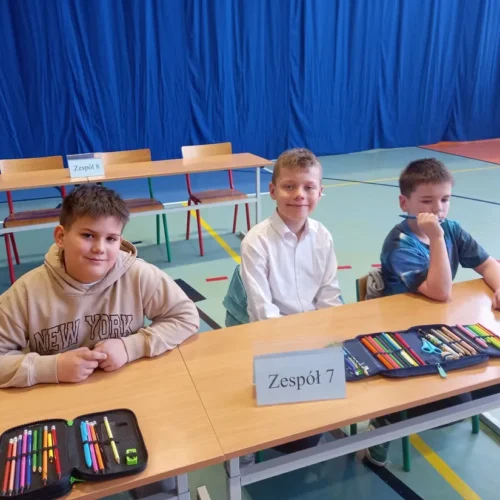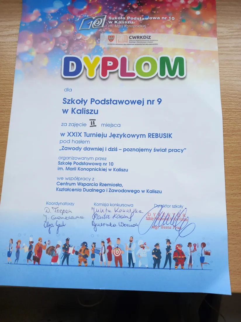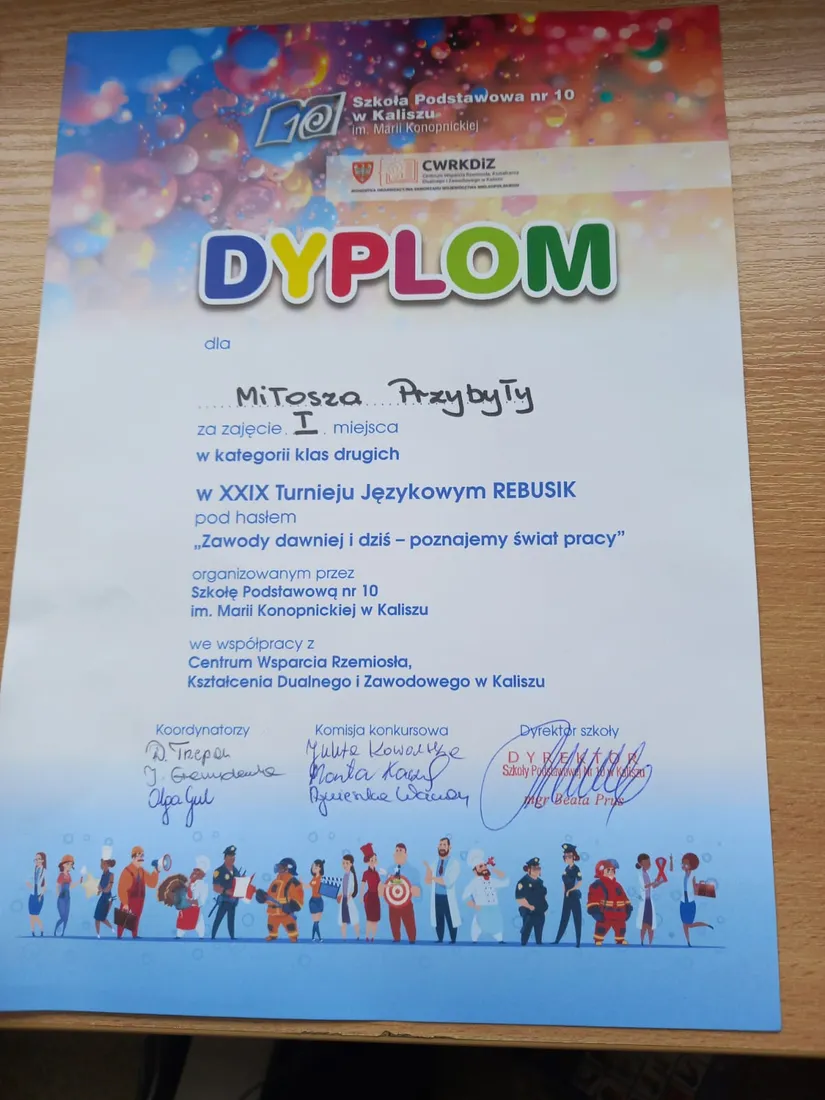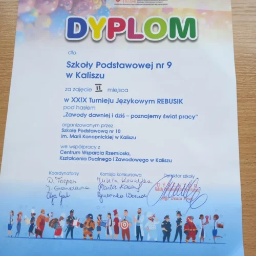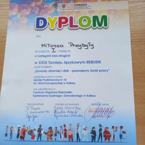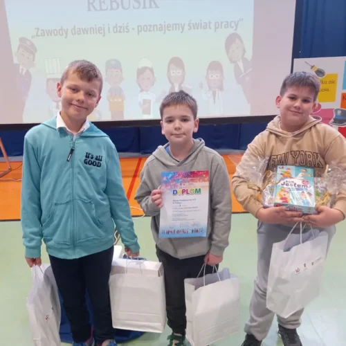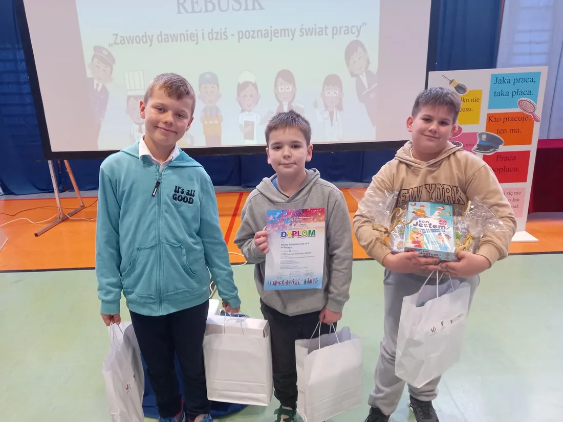 Z radością informujemy, że 17.03.2026 r. reprezentacja naszej szkoły w składzie: Igor Wdowyczyk z klasy 1b, Miłosz Przybyła z klasy 2b oraz Wojciech Mydlach z klasy 3a zdobyła II miejsce w turnieju językowym REBUSIK pod hasłem „Zawody dawniej i dziś- poznajemy świat pracy” organizowanym przez Szkołę Podstawową nr 10 w Kaliszu.