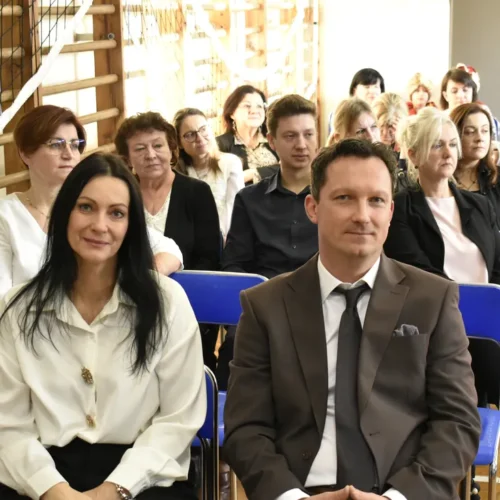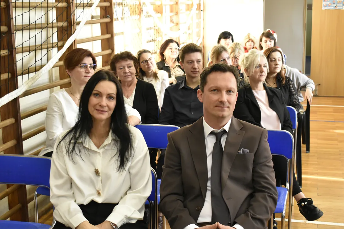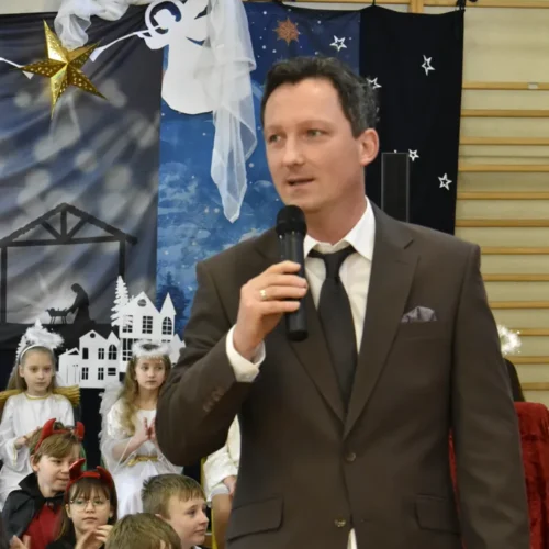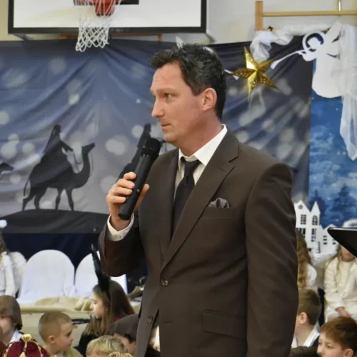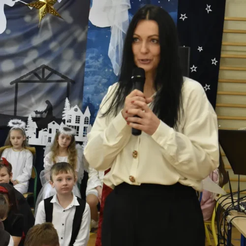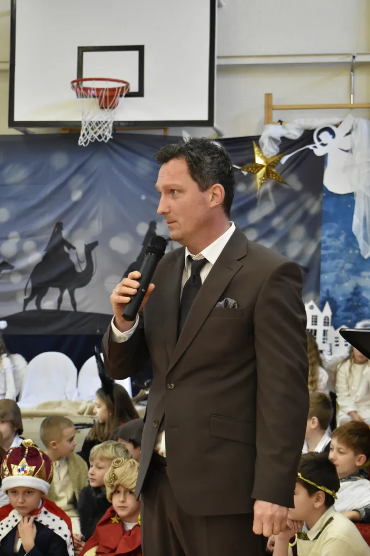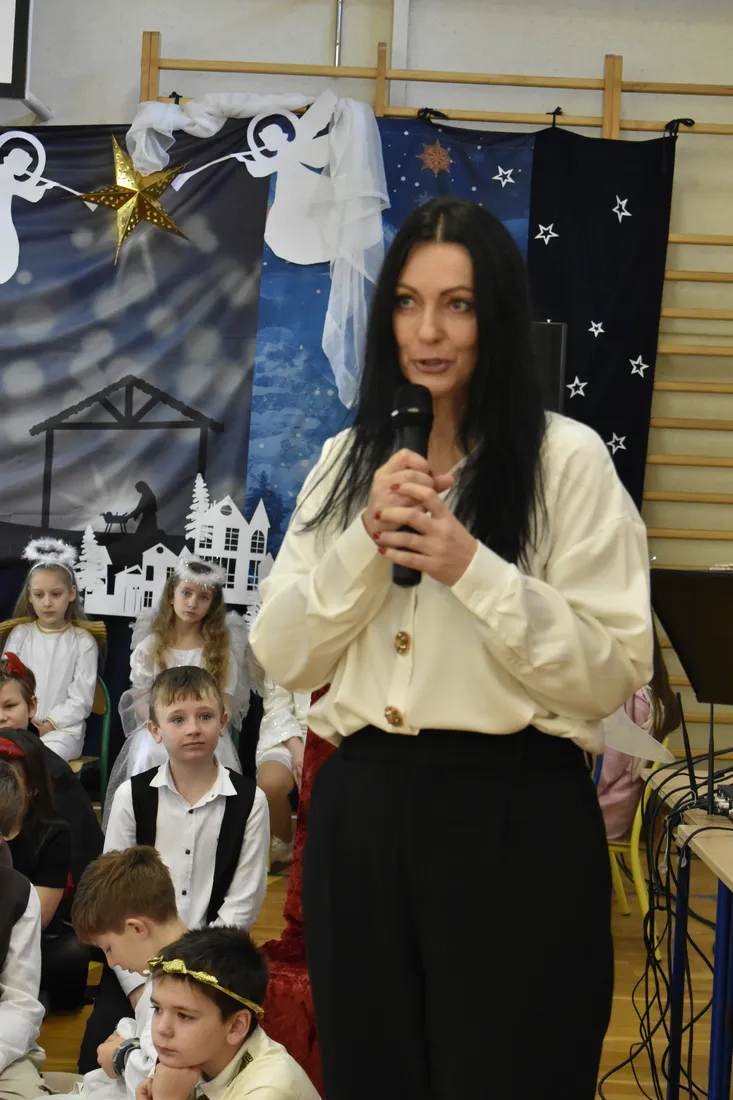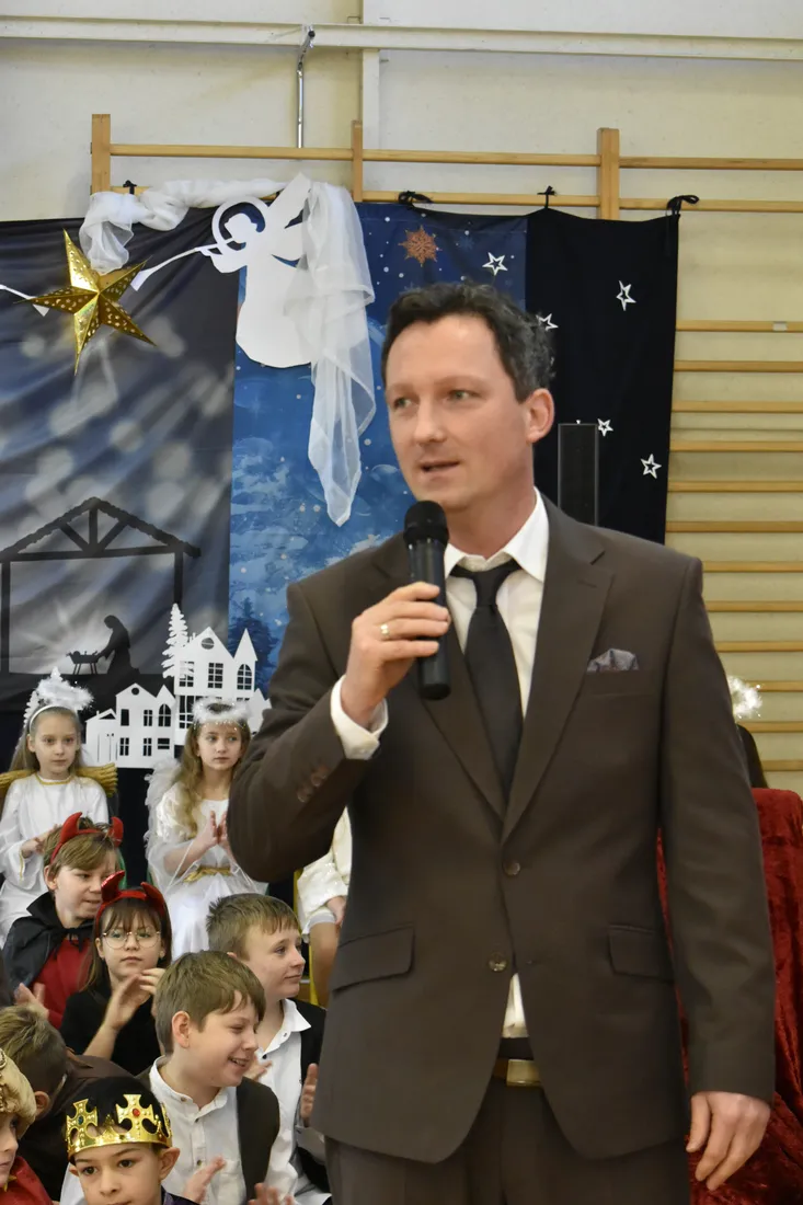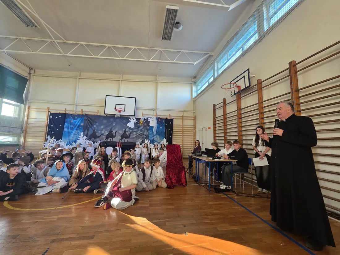 Po występie życzenia świąteczne całej społeczności szkolnej złożył dyrektor szkoły pan Emil Jesiołowski. Z radością gościliśmy również przewodniczącą Rady Rodziców p. Magdalenę Pancewicz oraz proboszcza naszej parafii ks. prałata Jacka Plotę, który swoją obecnością podkreślił wyjątkowy charakter tego wydarzenia.