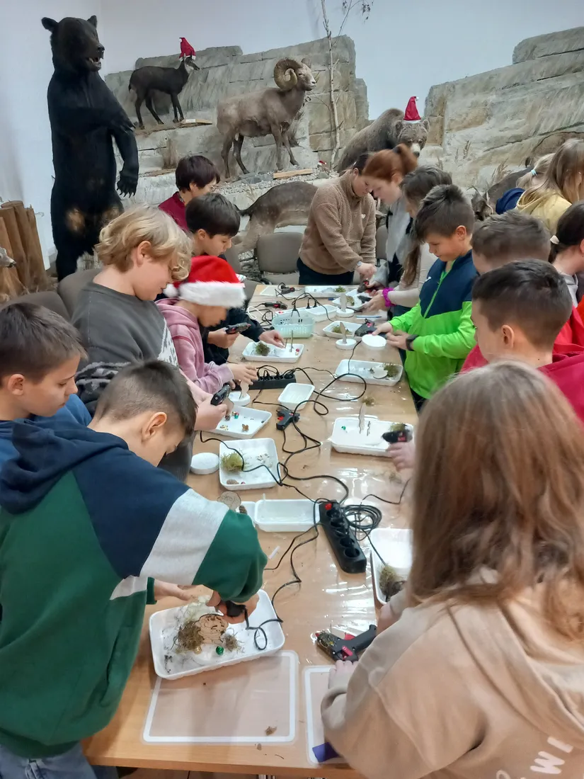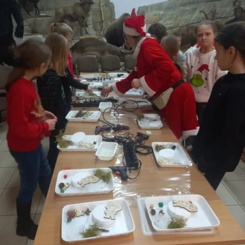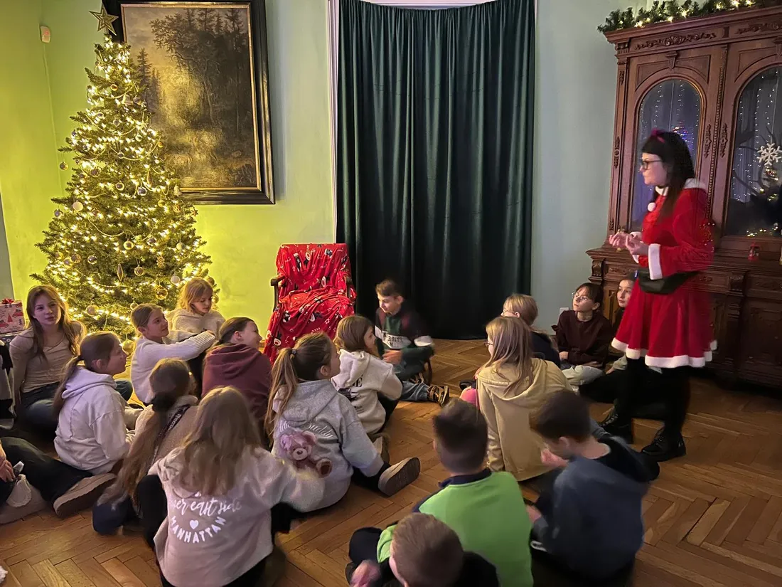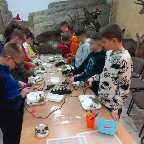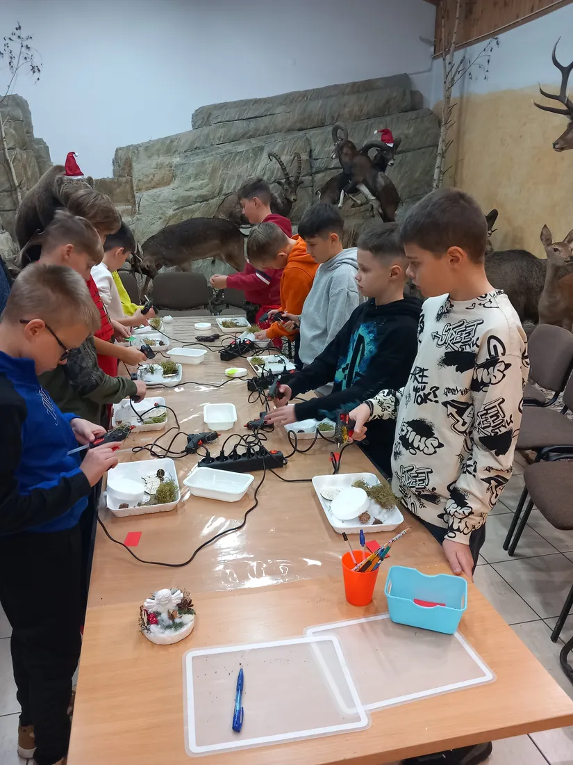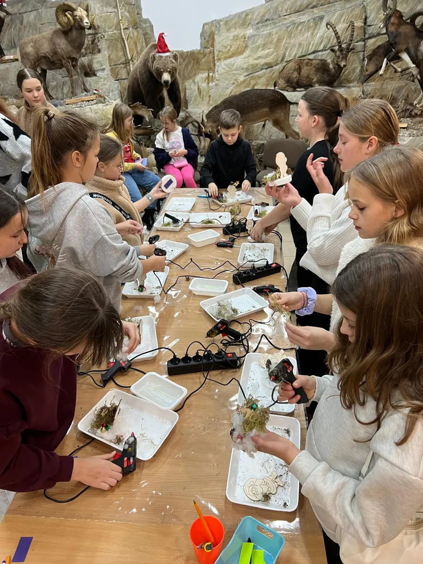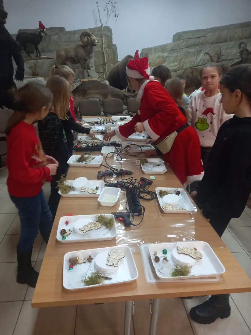 Pierwszym punktem programu było Muzeum Przyrodniczo-Łowieckie w Uzarzewie, gdzie uczniowie wzięli udział w warsztatach edukacyjno-plastycznych. Podczas zajęć poznawali tradycje bożonarodzeniowe, zimowe zmiany zachodzące w przyrodzie oraz wykonywali własne ozdoby świąteczne. Dużą atrakcją było także spotkanie z Mikołajem, który wręczył dzieciom prezenty.