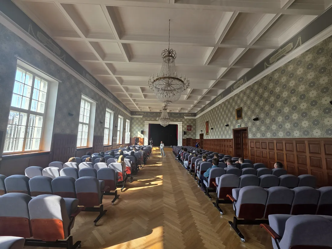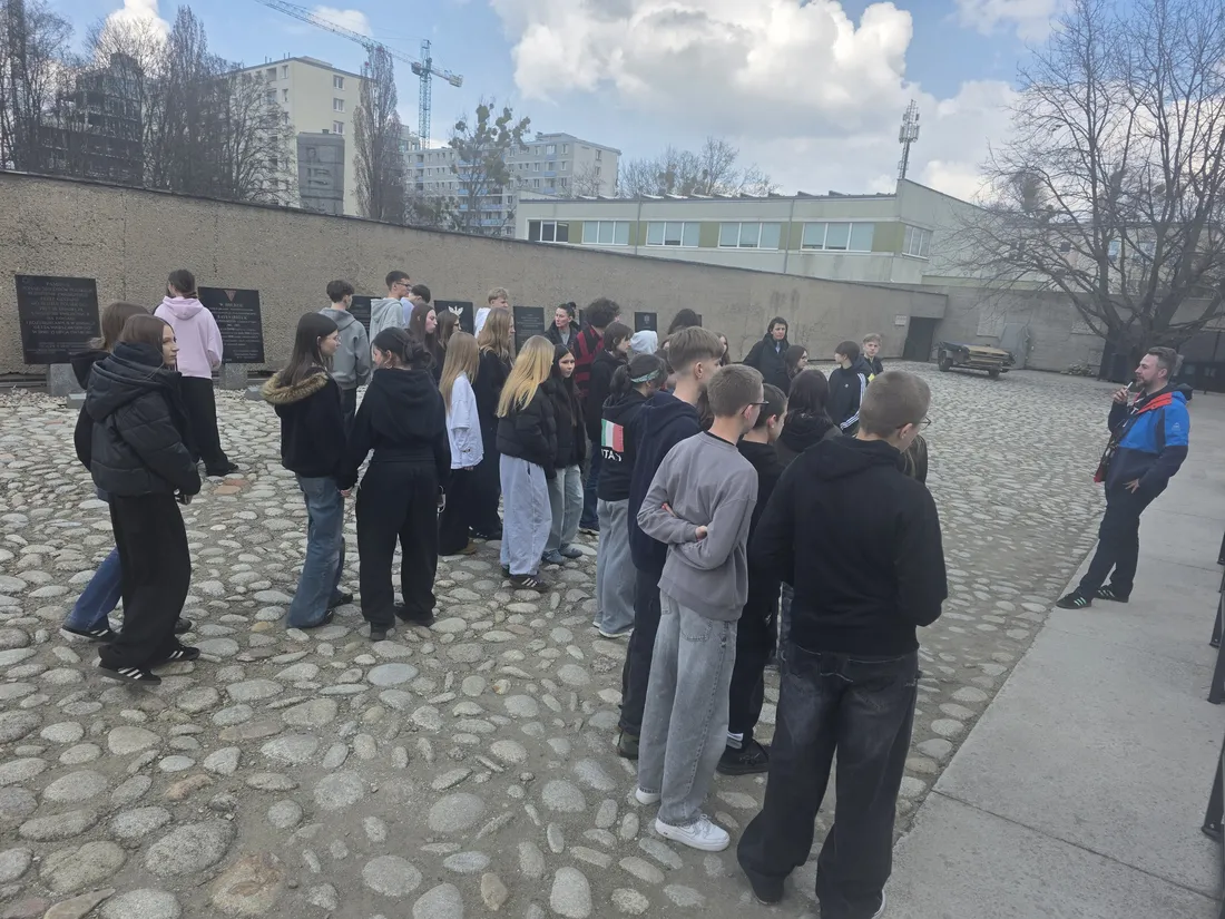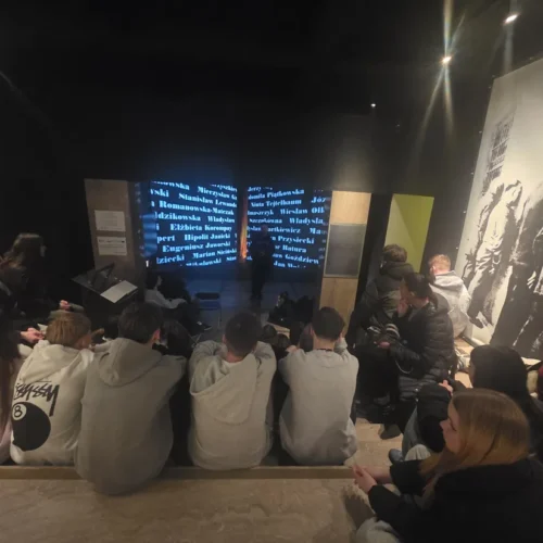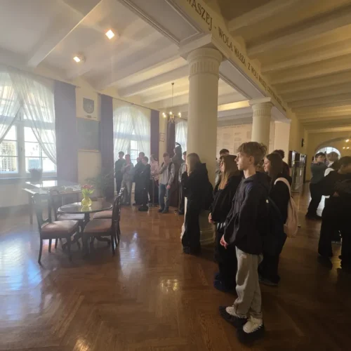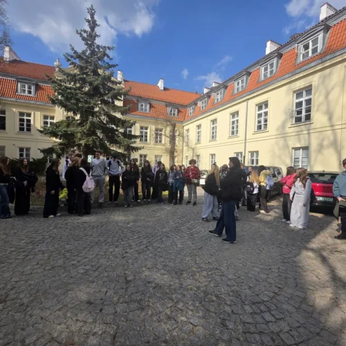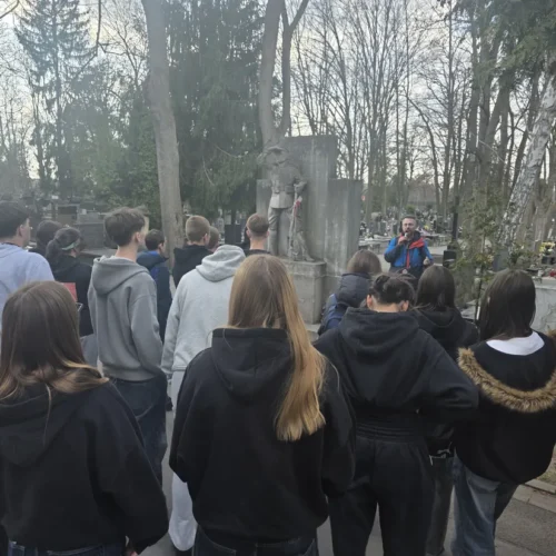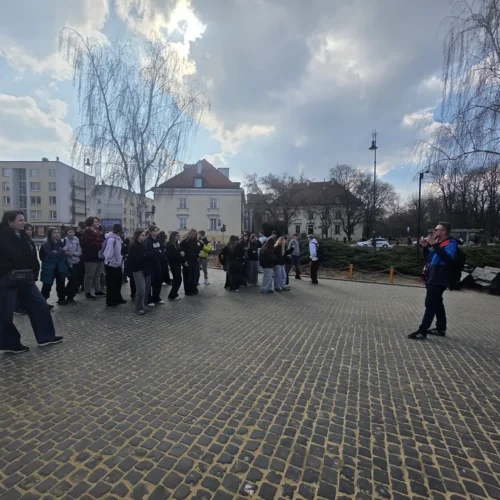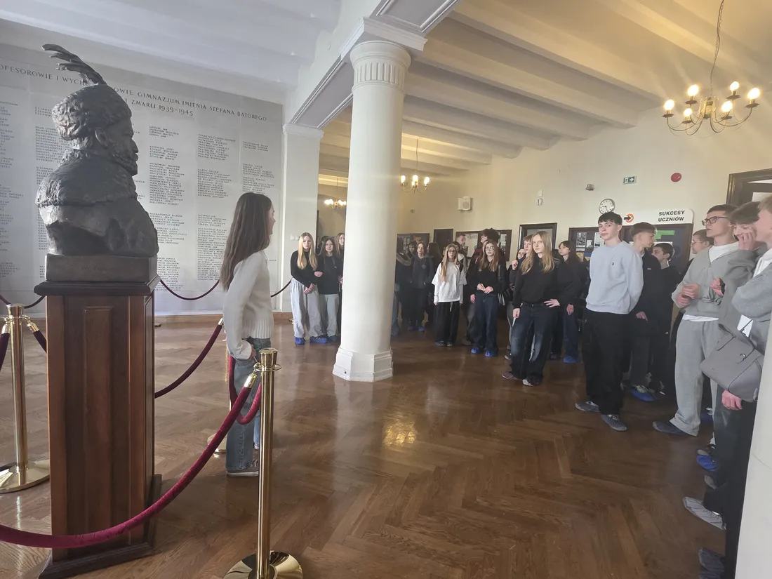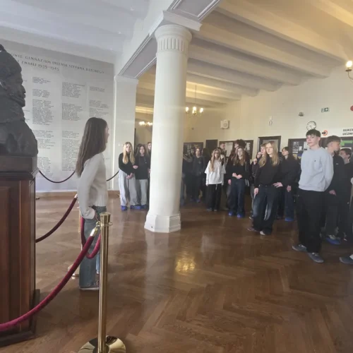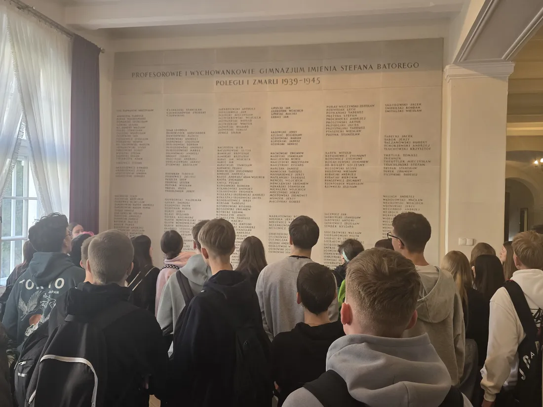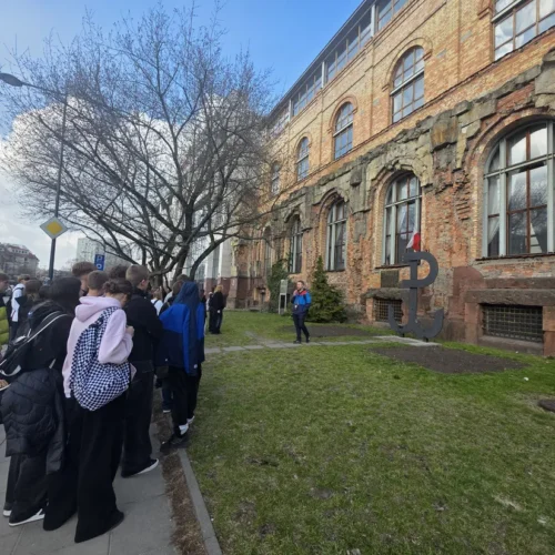 Naszą podróż rozpoczęliśmy o godzinie 9:00 spotkaniem z przewodnikiem przy Liceum Ogólnokształcącym im. Stefana Batorego – szkole, do której uczęszczali bohaterowie książki. Zwiedzanie wnętrz budynku pozwoliło nam wyobrazić sobie ich codzienne życie jeszcze przed wybuchem wojny i uświadomić sobie, jak bardzo zmieniło je doświadczenie okupacji.